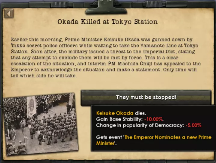 这将迅速恶化国内各派系之间的关系,裕仁天皇将批准由在上次大选中获胜的立宪民政党领袖候选人町田忠治出任临时首相以应对危机。他将迅速举行内部选举,以决定谁最适合团结国内的民主力量,从而对抗正计划发动另一场政变的军方。