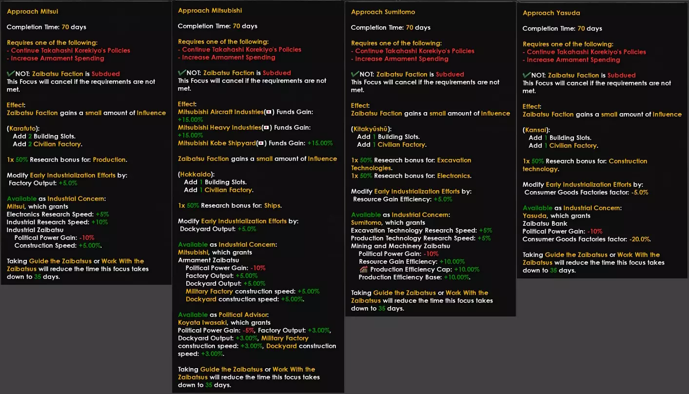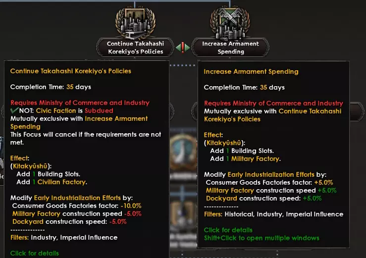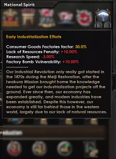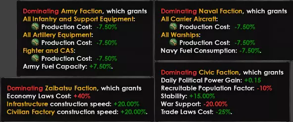 这意味着你可以专注于某一特定方面以提升效果:陆军派系和海军派系会降低各自装备的生产成本,财阀派系会提升民用工厂和基础设施的建造速度,而民政派系会增加政治点数并降低更改贸易法案的成本。