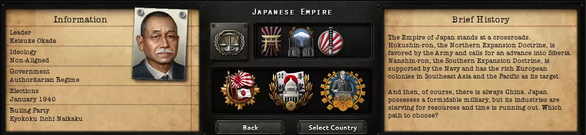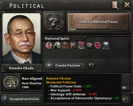1936年日本的政治局势 日本最初设定为中立国的原因是,1936年初的日本实际上是一个拥有自由选举的民主国家,但在游戏开始后的数月及接下来的几年里,该国迅速滑向威权主义。我们曾考虑让日本以民主国家开局,之后转为中立国,最终通过国策树走向法西斯主义,但从游戏机制角度来看,这样做并无太多实际意义。因此,日本将在40年代初通过建立真正的一党制国家,将法西斯主义确立为其国家意识形态。接下来,让我们来看看全新的国家精神!
