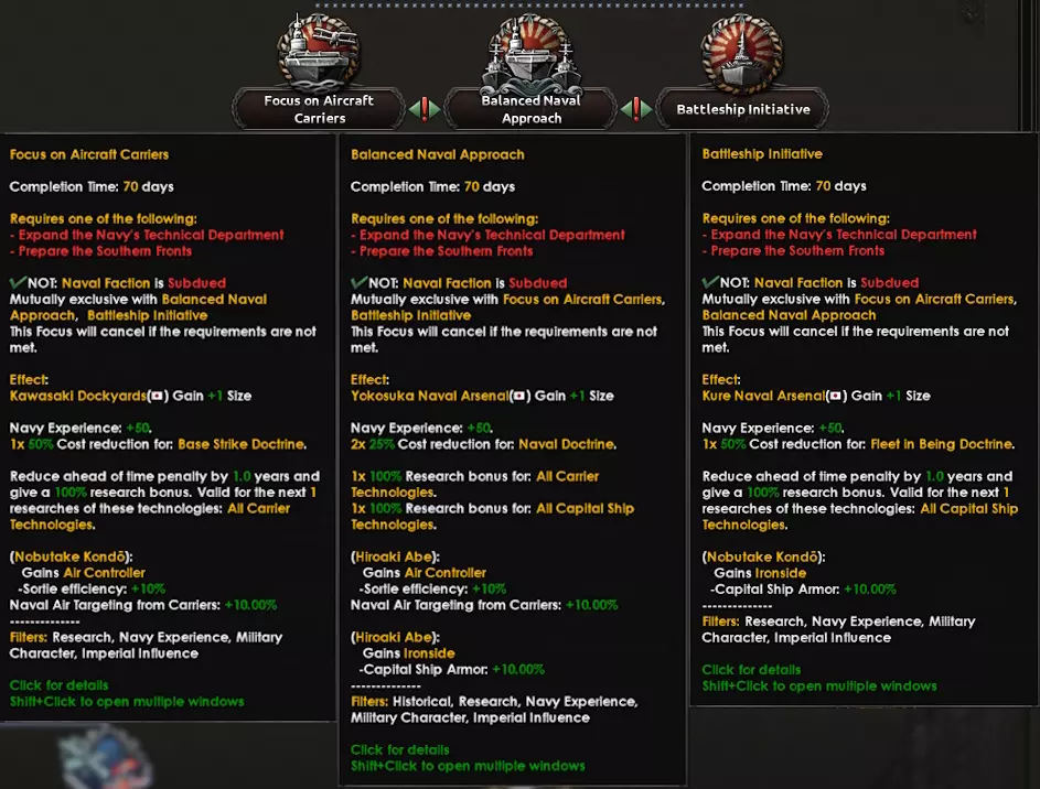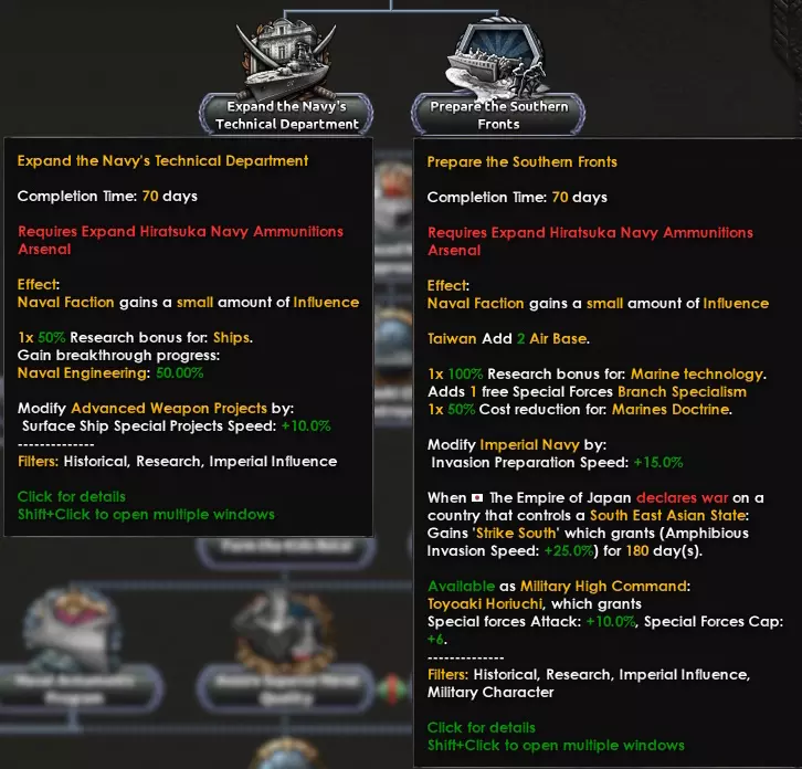 在决定海军发展方向之前,你可以【扩建海军技术部门】以获得一些不错的科技加成,或者【准备南方战线】以改善未来对东南亚的海军入侵——不过这两项措施都应该会很有帮助。