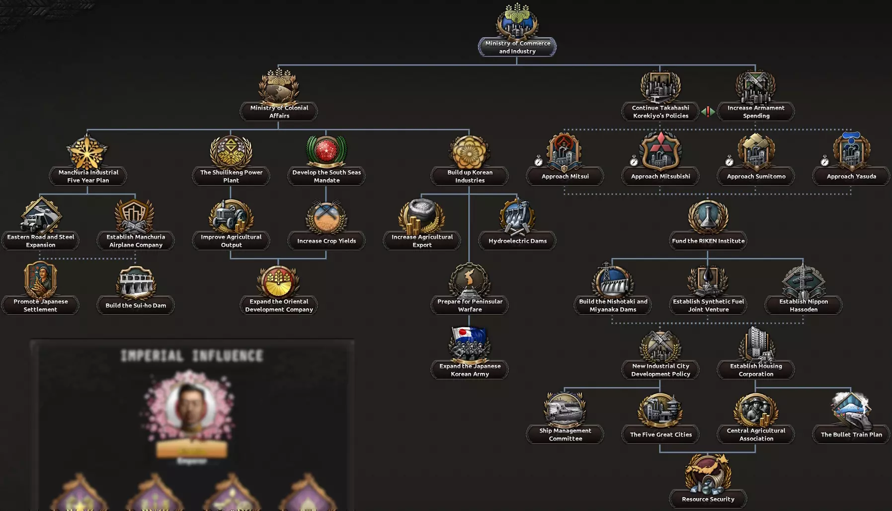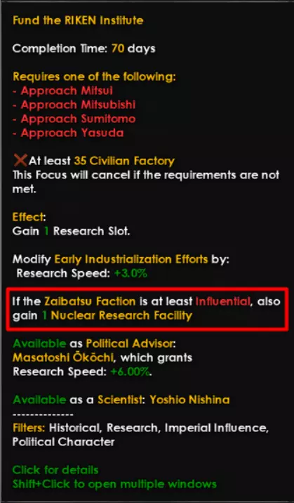 资助理化学研究所拥有我们上面提到的那种效果,即如果财阀派系在帝国影响力中至少达到有影响力级别,你将获得一个核研究设施——我觉得这相当不错。