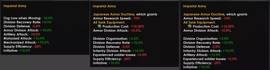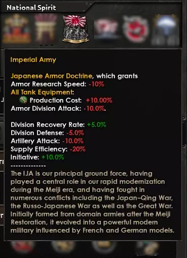 这里有很多内容需要解释。你可能已经注意到,【帝国陆军】这个国家精神与其他国家精神略有不同,它在某种程度上分为两部分:顶部的【日本装甲学说】和下方的其他修正项。这种设计得益于去年的DLC【Götterdämmerung】,我们通过这种方式将装甲相关修正项与其他陆军修正项区分开来。原因在于日本坦克在装甲、火力和技术方面已开始落后于西方坦克。除此之外,从日本的整体战术来看,他们严重依赖突袭——强调迅猛打击——并且认为撤退是耻辱的。但他们最大的弱点或许在于后勤——无论是陆上还是海上的后勤。这些因素共同导致日本最终深陷中国战场,无法向内陆进一步推进。