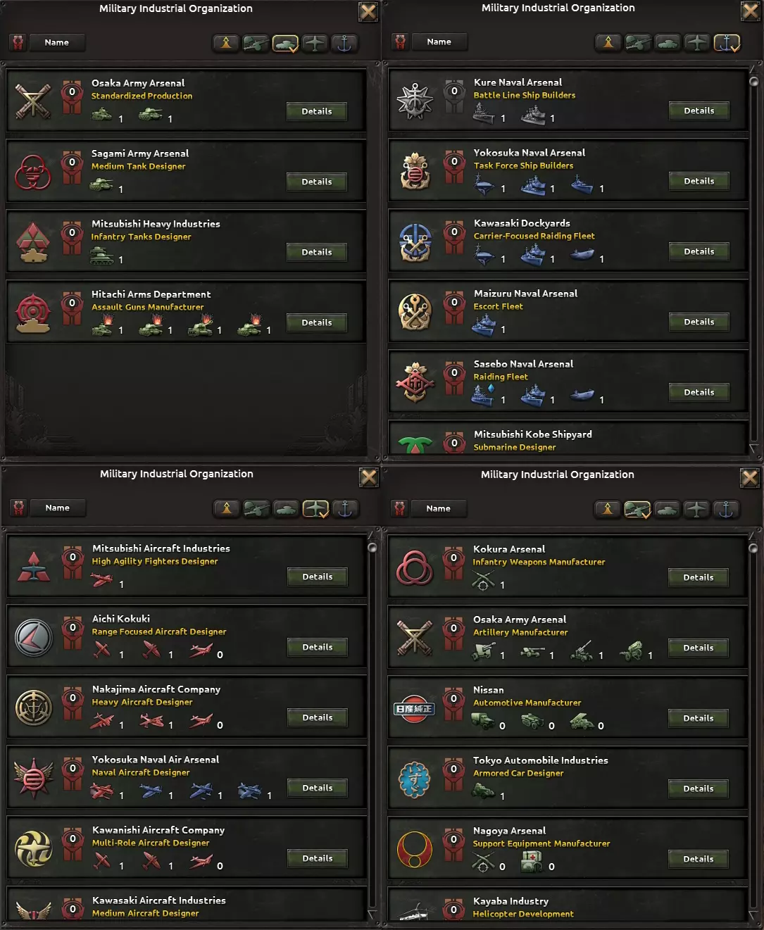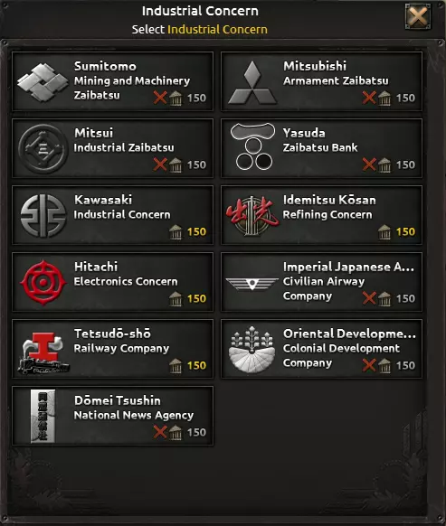 在开发本土岛屿时,你首先需要在继续执行高桥是清的政策和增加军备开支之间做出选择。之后,你可以与四大财阀(即工业集团)中的一个(或全部四个)进行接触,每个财阀至少会解锁一个工业企业。