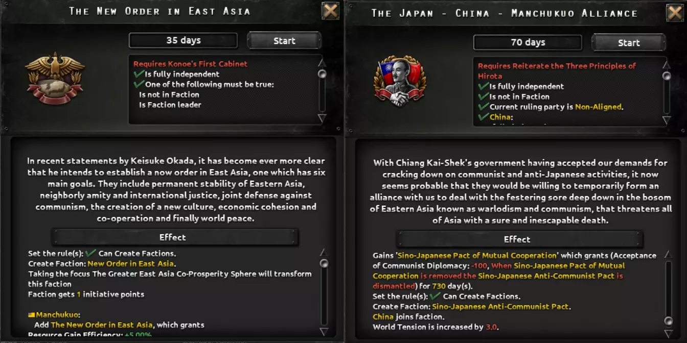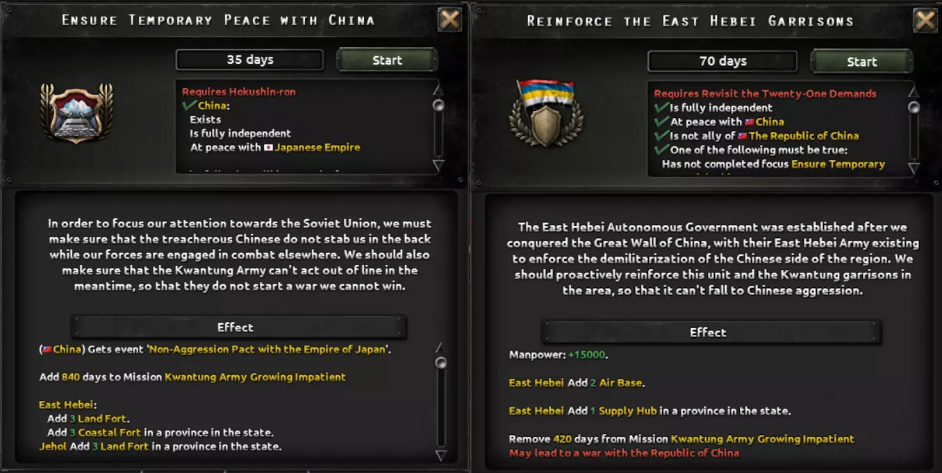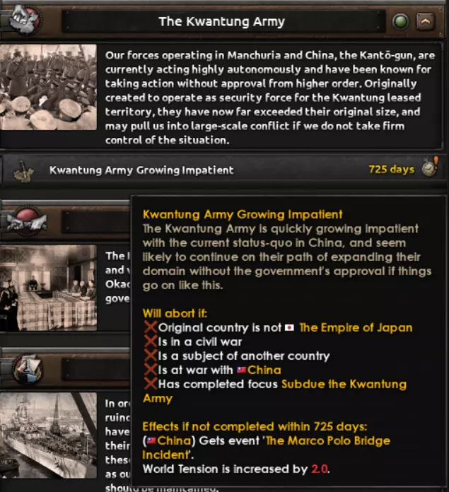 正如开发者角落中简要展示的那样,日本的另一项改动是,现在日本不再能完全掌控何时甚至是否对中国开战,而是取决于其选择的发展路线,可能会被迫发动战争,无论其是否愿意,因为关东军一直在寻求新的机会来扩大其控制区域。这意味着,尽管你可以选择推迟或提前开战,但历史线的日本无法避免与中国即将发生的冲突。