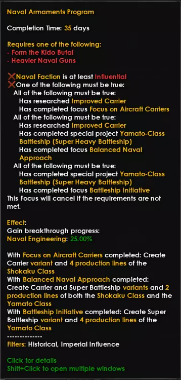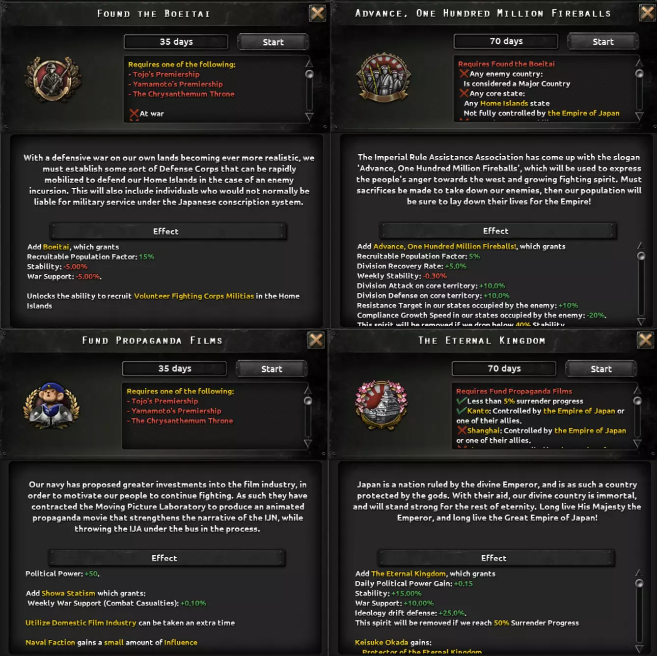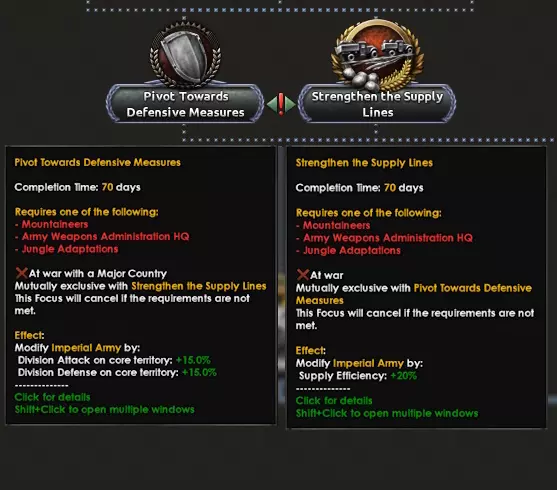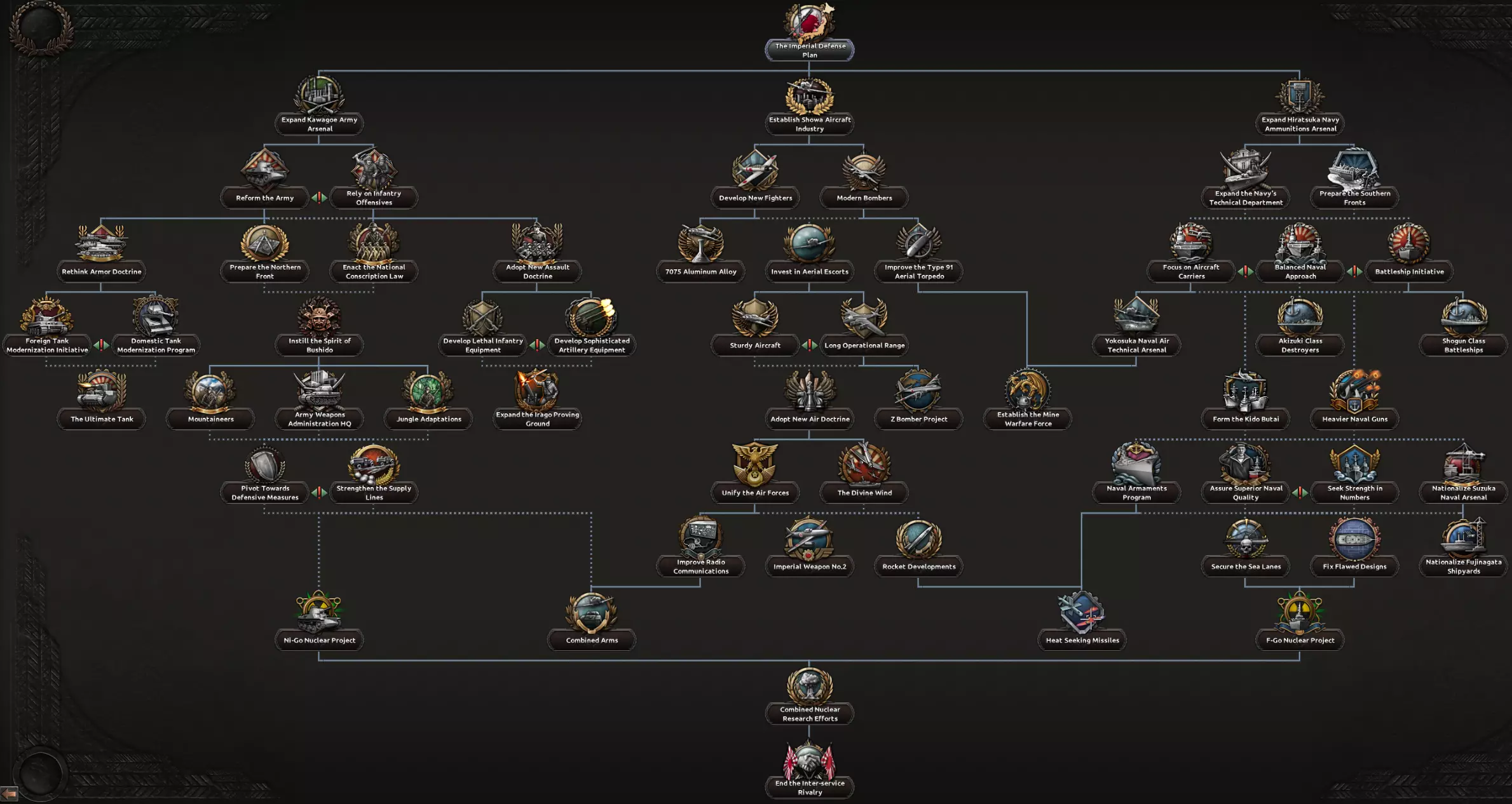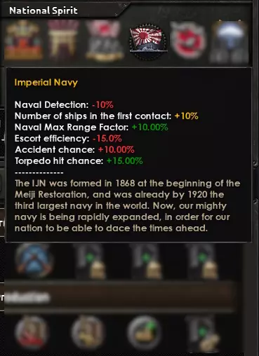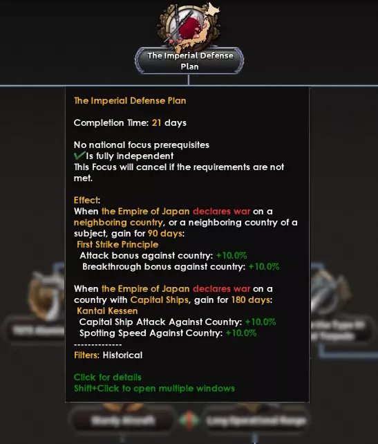 日本陆军到海军,多少都秉持着速战速决的理念。陆军注重快速机动的步兵单位,旨在打赢速决战;海军则遵循“舰队决战”思想,力求通过一场战役击溃敌方海军(咳咳,美国咳咳)。因此,各军种均以【帝国国防计划】为起点,若对符合特定目标的国家宣战,将获得国家精神。