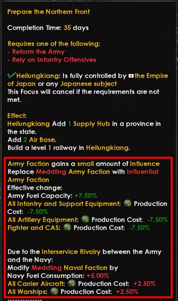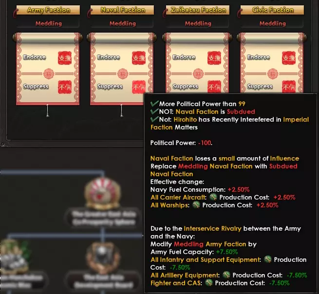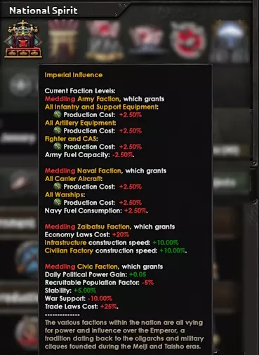 由于军种间的竞争,陆军派系和海军派系是唯一会直接相互影响的派系;只要它们处于同一等级,双方都会受到轻微的生产费用惩罚,而如果其中一方的等级高于另一方,影响力更大的一方将获得生产费用加成,另一方则会受到更严重的惩罚。这意味着你可以在入侵中国之前和期间通过建造大量步兵和炮兵装备来开始支持陆军,之后再转向支持海军,建立强大的舰队以对抗盟军。 帝国影响力中的派系影响力等级不仅决定了每个派系的加成,还将决定你是否能够选择某些国策。