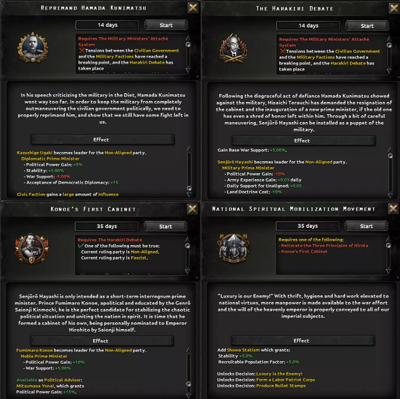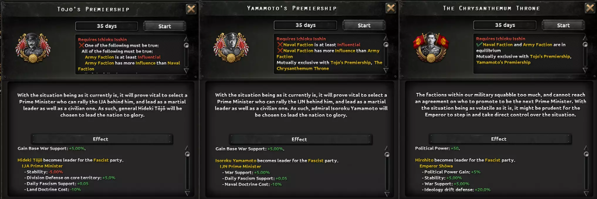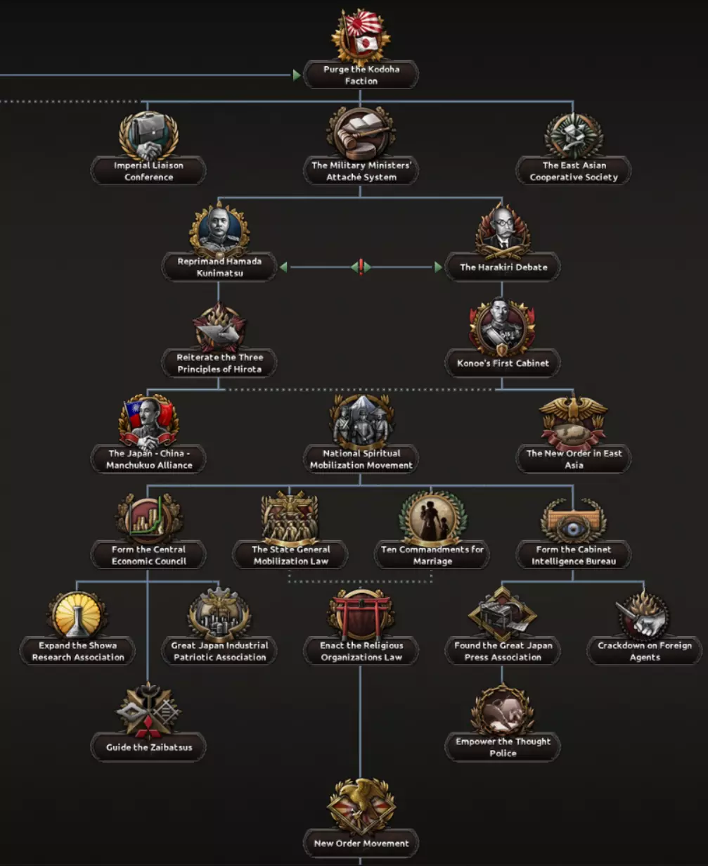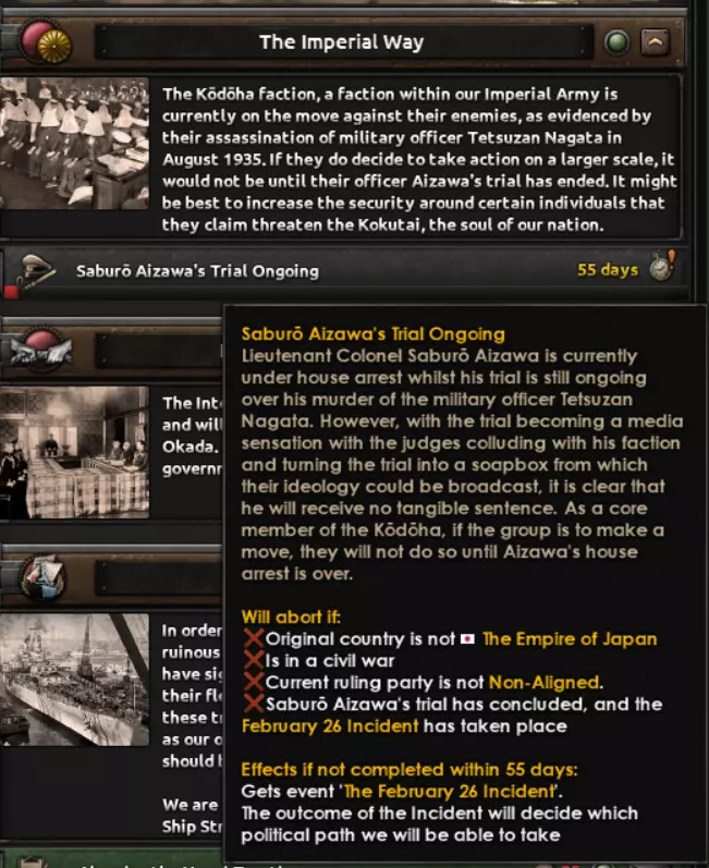 为了重申开发者日志中提到的部分内容,日本国策树中的所有政治路线都始于皇道派准备发动未遂政变,其目的是取代腐朽的政府并恢复日本传统。然而,在他们行动之前,需要在一名领导人受审期间将其从软禁中释放,这为你提供了一段准备的缓冲时间。 当政变爆发时,你所选择的结果将决定你接下来的路线,并自动完成第一个互斥的政治国策选择,引导你走向历史路线、皇道派路线或反军方路线(后者之后会发展为民主路线或共产主义路线)。所有这些路线在未遂政变发生前均处于锁定状态。选择让军方镇压皇道派的选项将进入历史路线。