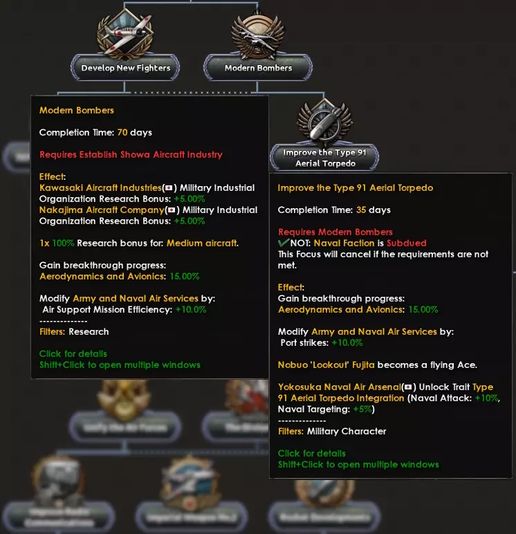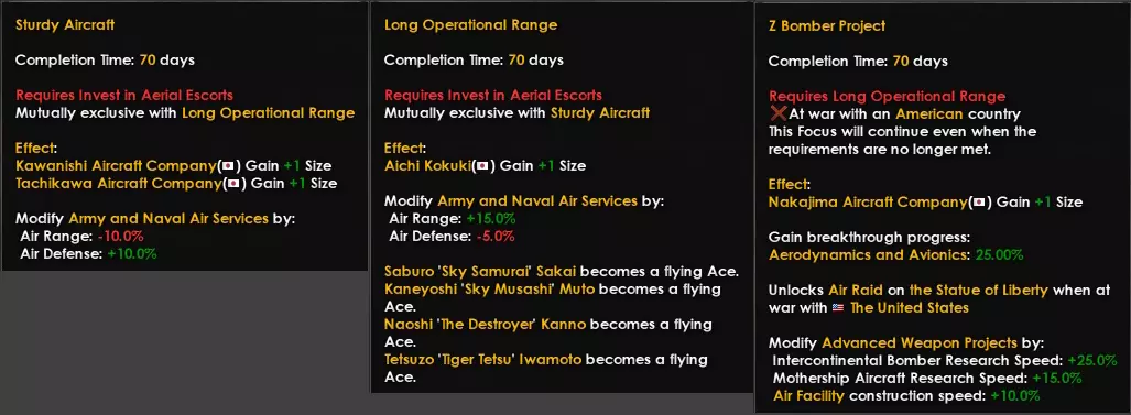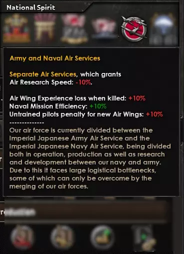 历史上,日本曾拥有两支不同的空军力量:陆军航空队和海军航空队——并且他们会对任何技术进步都对彼此严加保密(没错,他们的军种间竞争非常激烈)。在游戏中,我们将这两支力量整合为一个国家精神【陆军与海军航空部队】,但我们再次可以看到,该精神也被【独立航空部队】科研惩罚和其他修正效果一分为二。日本或许在游戏开局时拥有最优秀的航母舰载机联队,但在后期因飞行员损失速度过快而遭受巨大打击,这是因为他们的训练极为严苛。这意味着他们无法足够快地补充损失,只能使用未经训练的飞行员。