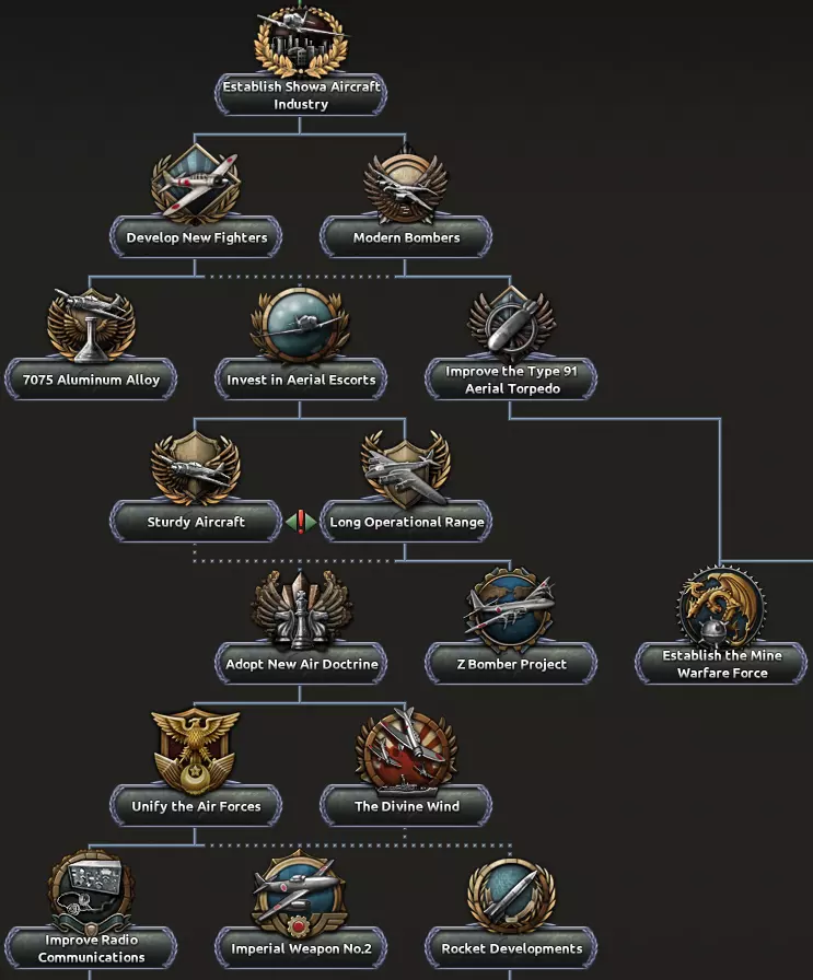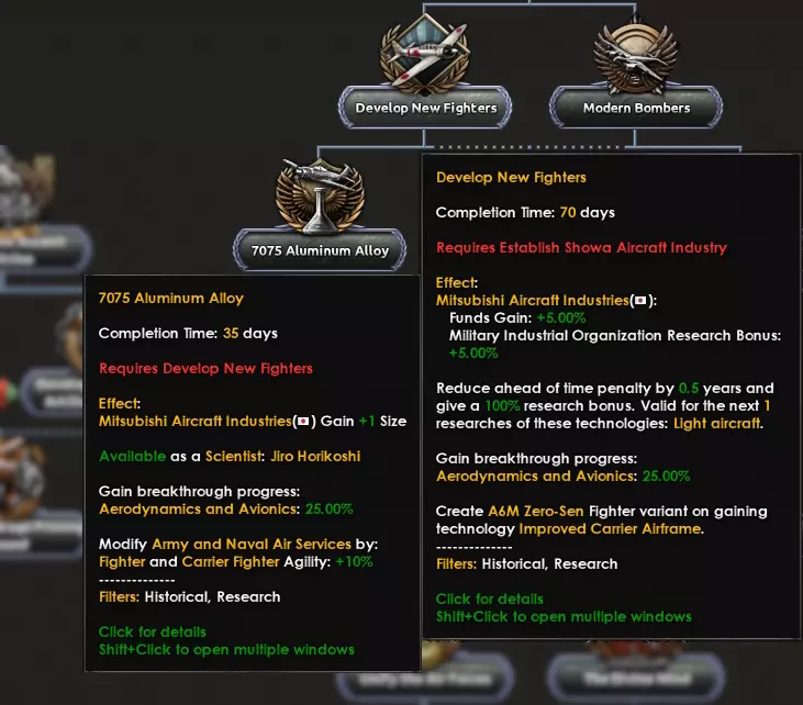 所有日本玩家,欢呼吧!你们再也不必在零式战斗机和大和号之间做出选择了!现在,作为【陆军和海军航空队空军分支】的第二个国策,你可以通过研发新型战斗机来开发零式战斗机,然后通过完成7075铝合金项目使其变得更好。