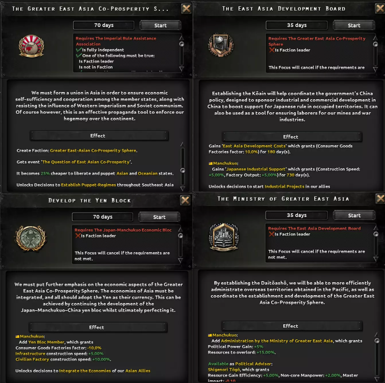 再往下发展,日本可以采取更极权的方式,将法西斯主义作为其统治意识形态,并与德国和意大利签署三国同盟条约。这样做将解锁大东亚共荣圈分支,从而能够对新获得的亚洲属国进行剥削和开发。