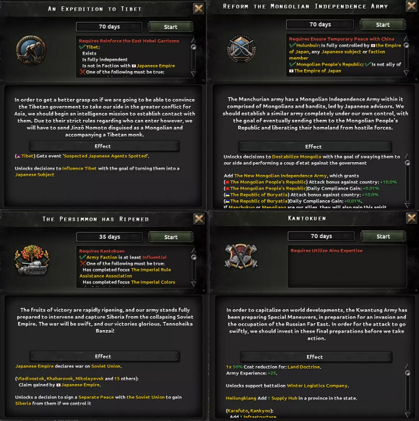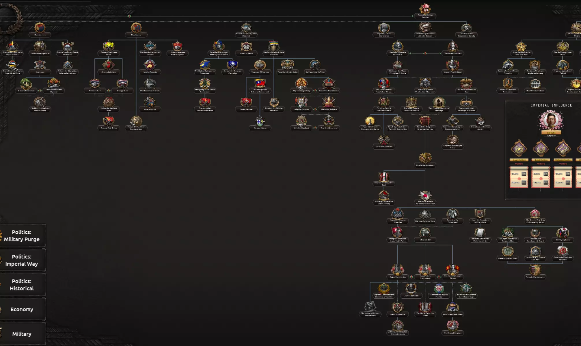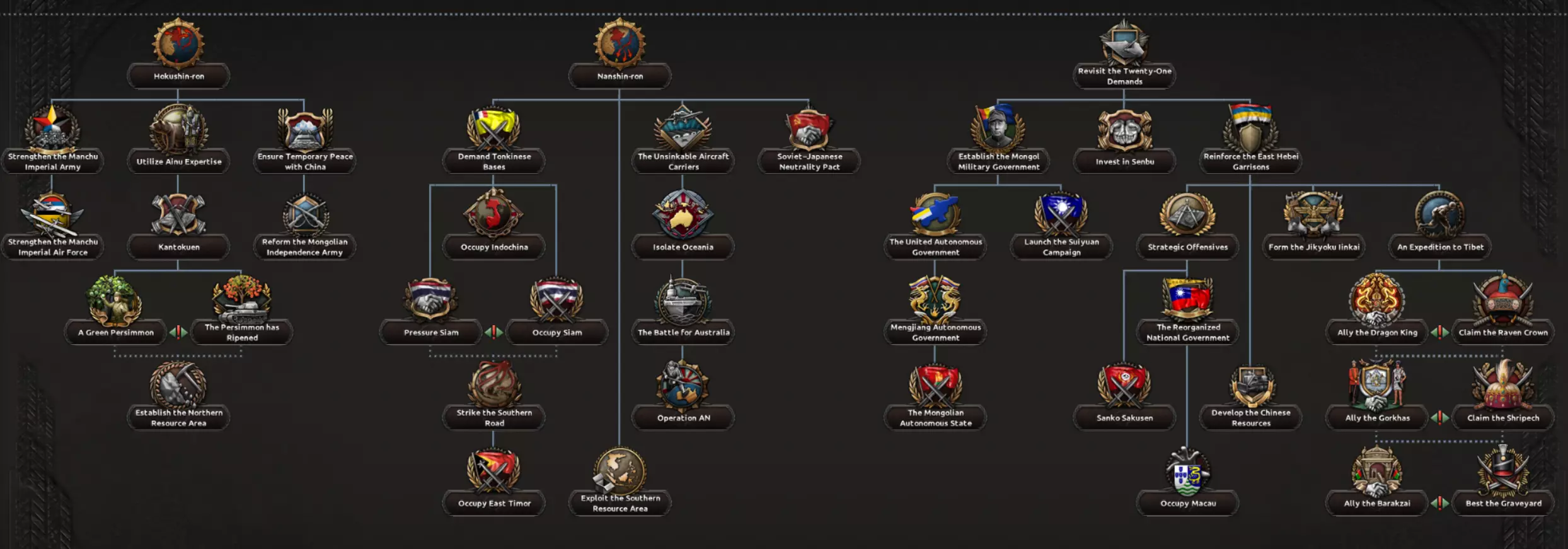 首先需要注意的是,历史政治树的外交政策分支与皇道派路线共享。该分支分为三个不同的子分支,从左到右分别涉及北方扩张、南方扩张以及西方与中国事务。