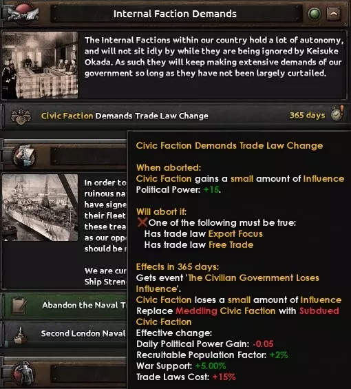 如果某个派系的影响力足够大,他们还会开始提出要求。完成这些要求会让他们获得额外影响力,反之失败则会失去影响力。如果你玩过历史线的意大利,应该对“墨索里尼事件”比较熟悉,墨索里尼会要求做某些事,派系要求的大致情况和这类似。