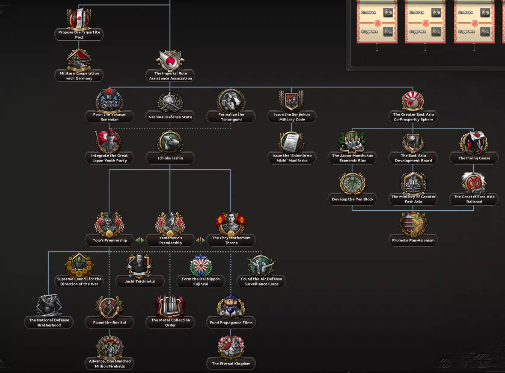 在科技树的底部,是关于在战争后期及征服巅峰阶段由谁领导日本的最终重要选择。在此处,根据内部派系的实力,你将可以选择东条英机或山本五十六,或者让天皇直接介入并掌控大政翼赞会。