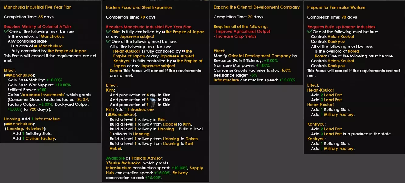 殖民事务部下分支专注于通过建设民用工厂、军用工厂、大坝、基础设施和资源勘探来发展你的傀儡国伪满洲国以及太平洋地区的殖民地,同时助力自身经济发展。