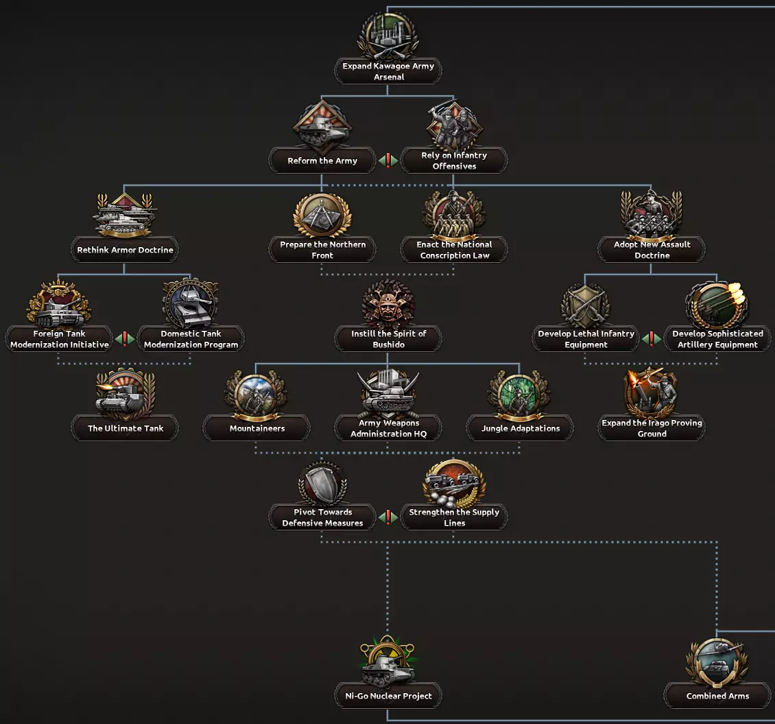 从一开始,当你选择陆军分支时就需要做出决定:是拥抱坦克优势并改革陆军,还是接受意志至上并依靠步兵进攻?无论选择哪种,都会提升你对装甲或步兵及火炮装备的研究和使用,让你能进一步专注于这些类别,并简化你的陆军和作战学说。