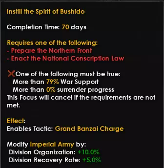 帝国陆军分别专注于坦克、步兵和炮兵后获得的国家精神 二战期间,武士道(武士的道德准则和生活方式)思想十分盛行,通过【灌输武士道精神】,你将集结军队并解锁【万岁冲锋】战术。