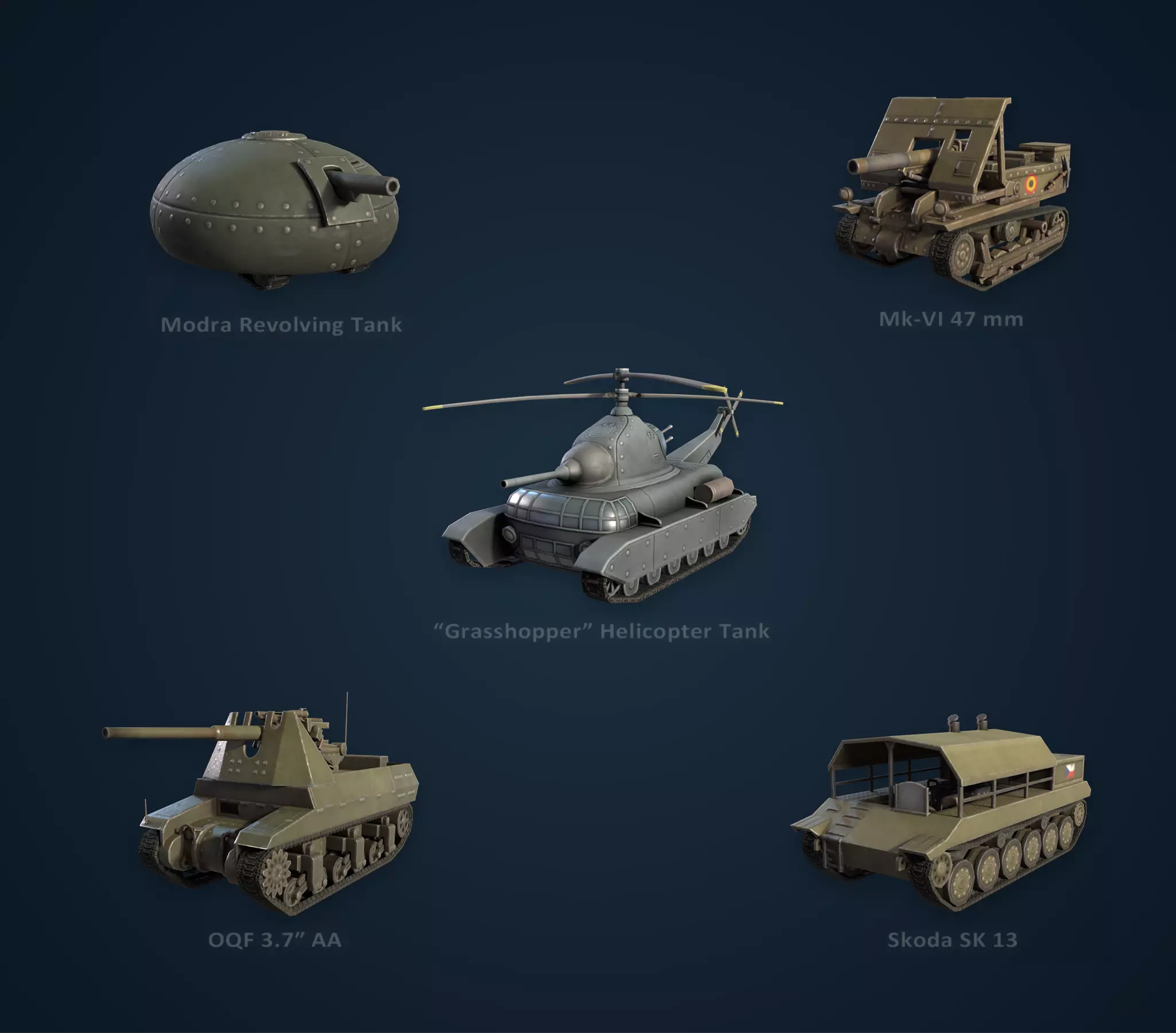 *莫德拉旋转坦克的设计特点是采用圆形旋转车体,能够偏转来袭炮弹。 *“蚱蜢”坦克旨在将新研发的直升机设计与坦克的火力相结合。然而,由于存在诸多设计问题,该设计很快被放弃。 *捷克的斯柯达SK 13是德国为应对战争末期日益严重的燃料短缺而研发的车型。实际上,这款载具是以煤炭为动力的。