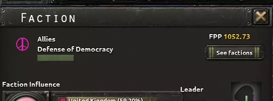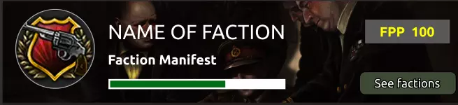 派系窗口标题早期模型 - 显示宣言、派系图标和派系力量投射 每个派系都有一份宣言。宣言关乎该派系的目标,例如征服新土地、阻止法西斯主义蔓延或其他类似的长期目标。 每份宣言都有一个完成百分比,该百分比会在游戏过程中上下浮动。当完成度足够高时,将根据宣言类型解锁一些奖励。