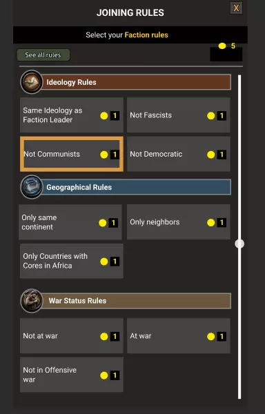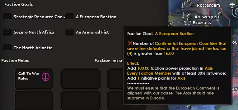派系类型/模板 所有派系都基于一个模板。因此,当你创建派系时,你需要从可用的类型中选择派系类型,然后会获得相应的一套规则和目标等。通过国策或事件创建的派系,其类型是预先定义好的。因此,创建派系所需的点击次数不应比以前多太多,但仍会提供一些选项。最重要的是,根据你选择的派系类型,会带来不同的游戏体验。 规则 每个派系都有一套规则。这些规则通常与特定的行动类型相关。例如,谁可以加入派系,或者派系中谁可以宣战。 一些例子: 加入规则可以基于申请加入国家的意识形态。例如,规则可能规定只有非法西斯国家可以加入。(但这不会阻止该国日后转变为法西斯国家)。另一个加入规则可以基于地理,即只有特定地区的国家可以加入。其他类型或规则涉及以下方面: 和平会议——为特定类型的行动提供加成 宣战——谁可以宣战以及有哪些要求 战争号召——谁可以号召战争,仅限派系领袖、任何人还是仅限主要国家等 开除——何时可以将成员踢出派系 贡献——派系贡献的最低要求是什么 领导权挑战——接管领导权需要满足哪些条件 可能还会有更多规则,其中一些可能不会实装,但你应该能明白大致方向。 如果派系领袖或其他成员国拥有派系倡议,这些规则可以在游戏过程中进行更改。