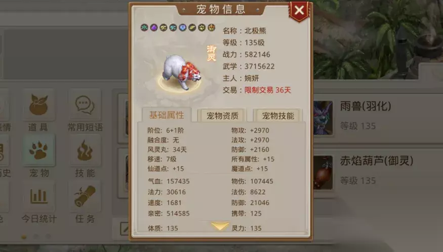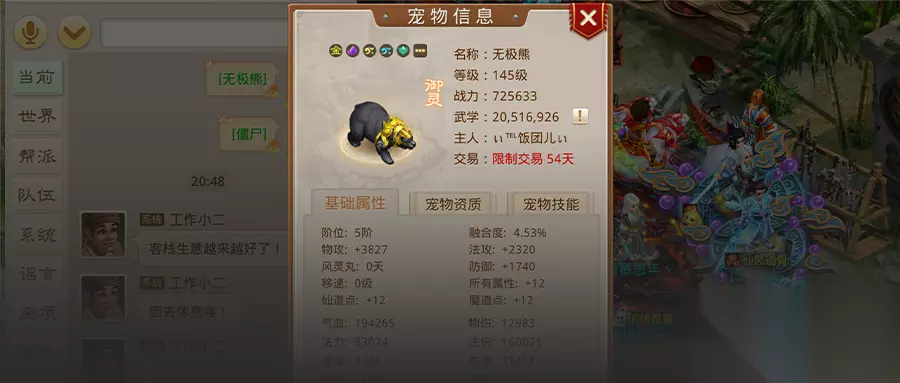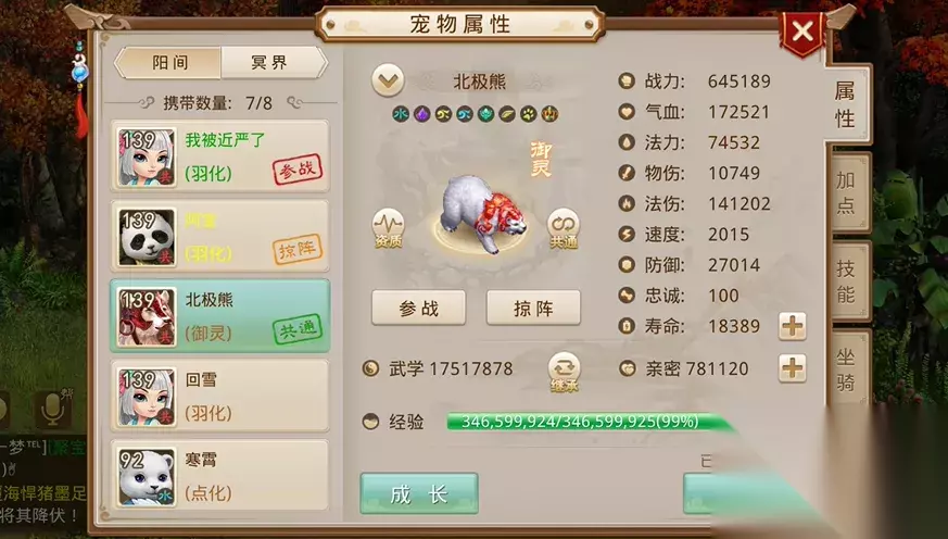 来自【二〇一六】区组的ぃ℡饭团儿*, 拥有全服法伤最高的无极熊, 法伤高达160347! 北极熊、太极熊都不是它的对手~ 全服气血最高、速度最快的为北极熊 全民争霸赛很多道友都会骑上北极熊, 整个比赛场白茫茫一大片白pp~
