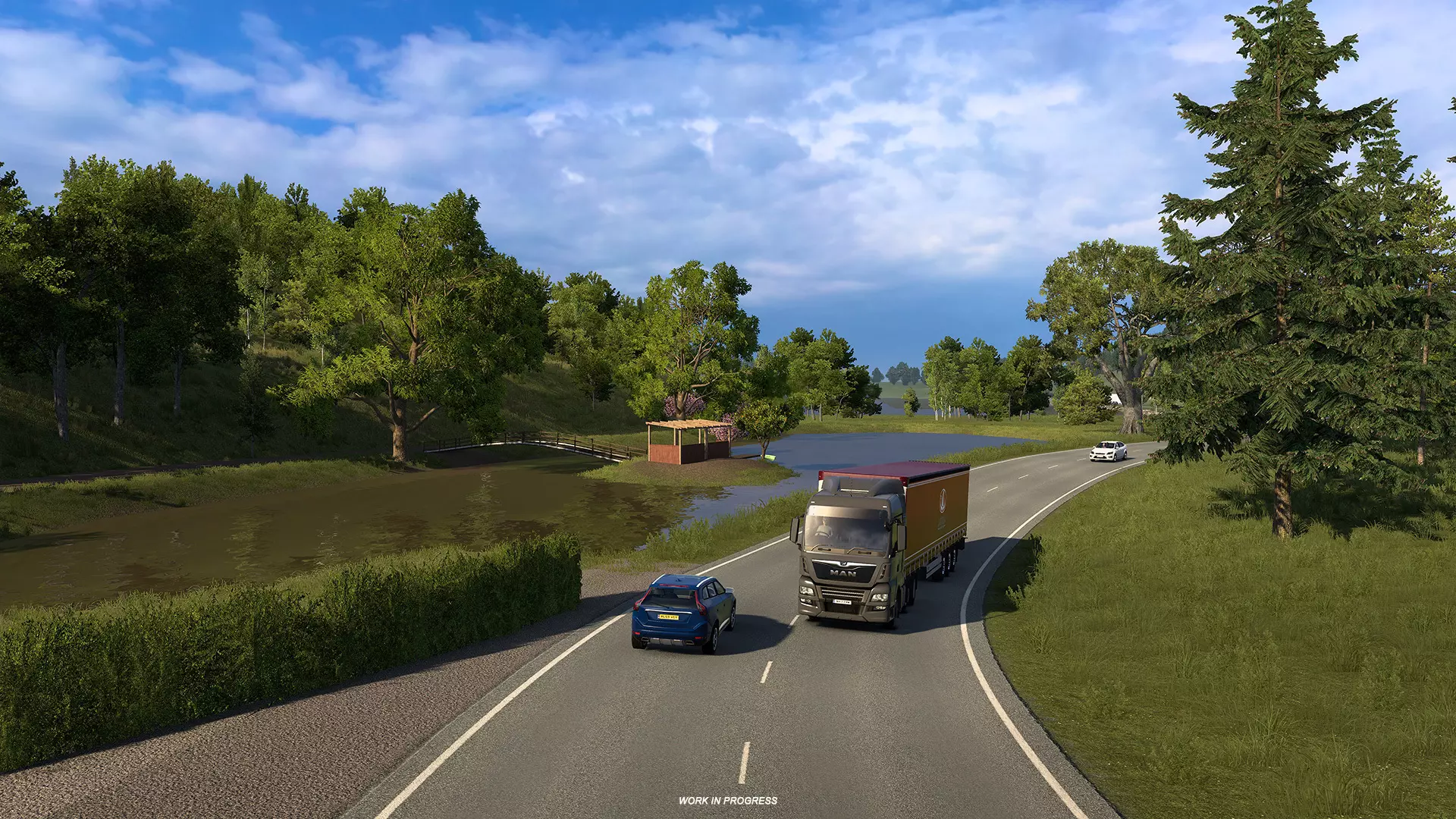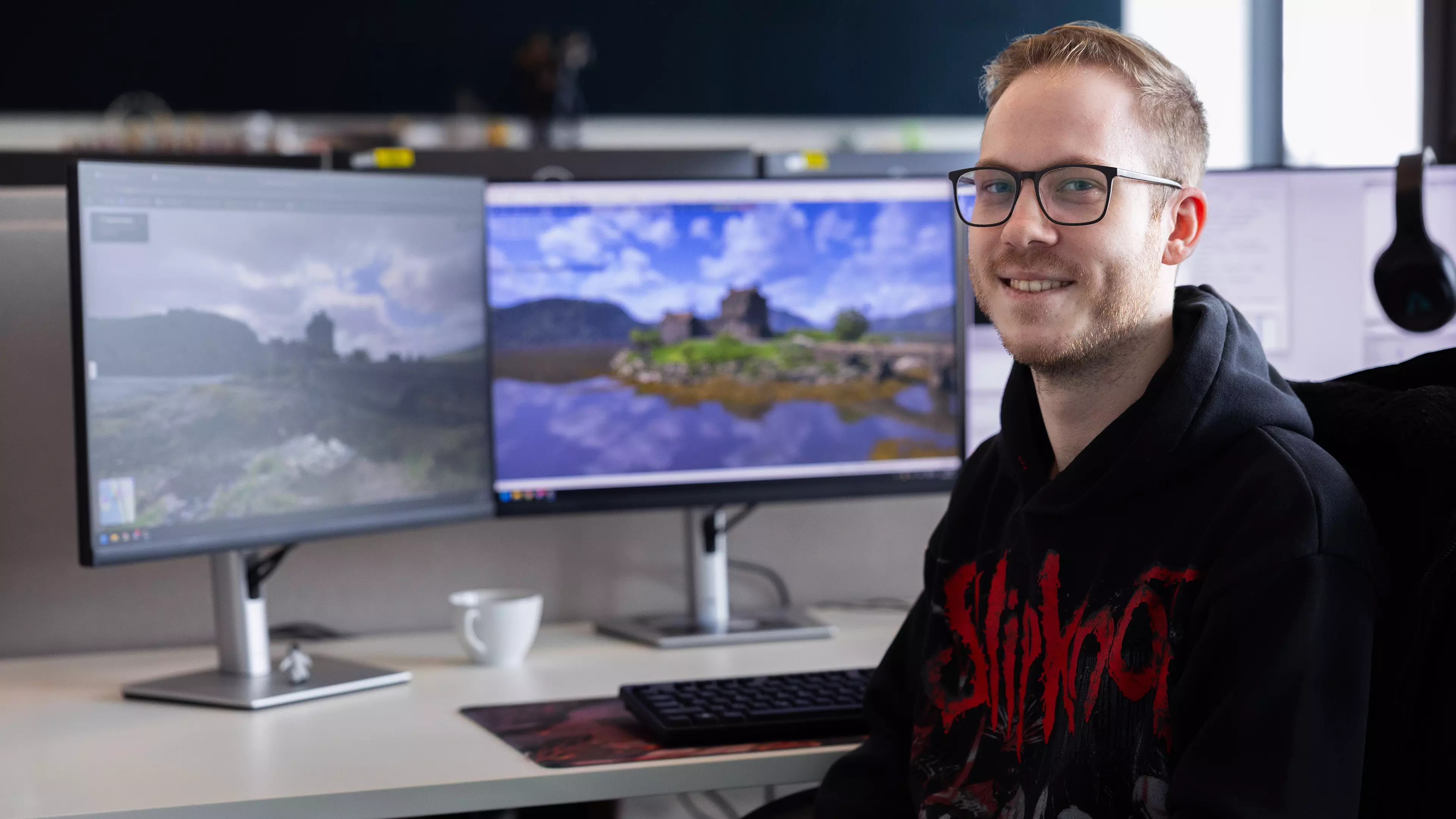 我在SCS工作已经快一年半了,至今仍有些难以置信。我最初参与了斯堪的纳维亚地区的更新工作,现在很高兴能成为英国重制项目的一员,具体负责苏格兰地区——在我看来,苏格兰是最美丽的地区之一。我很享受苏格兰的制作过程,尤其喜欢参与艾琳多南城堡的制作,你们可能已经见过它了。我目前的许多工作都集中在高地地区,那里的风景简直令人叹为观止。我很享受我的所有工作,因为这些工作包含了大量的山脉、湖泊,大部分是乡村地区。我想尽我所能捕捉苏格兰的自然风貌,这样我们的玩家总能有东西可看,并期待看到地图上下一个有趣的地方。现在我有一个问题要问我们的玩家:你相信尼斯湖水怪吗?