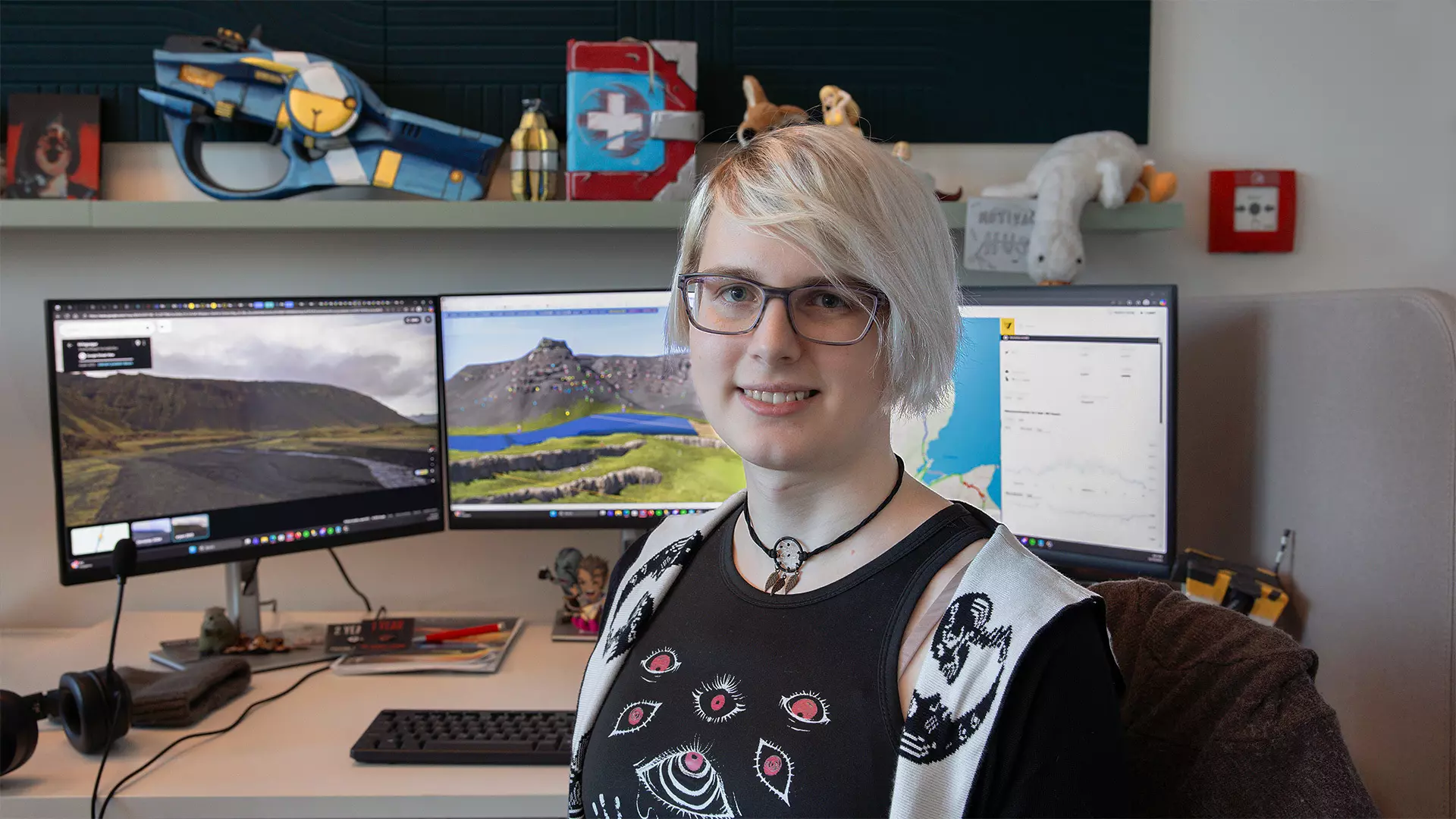 “我于2023年从艺术学校毕业后加入了SCS,希望找到一份能保持创造力的工作。我一直喜欢在电脑游戏中建造东西,以及在角色扮演游戏中探索地图,所以能够以建造小型世界为生真的是一种享受。到目前为止,我参与了希腊DLC和北欧视野DLC的制作——两者非常不同,但都充满乐趣!现在我很兴奋能参与冰岛独特景观的制作,惊叹于其整体之美、丰富的岩石以及树木的稀少,希望能在地图中尽可能多地加入绵羊。” 阿什利