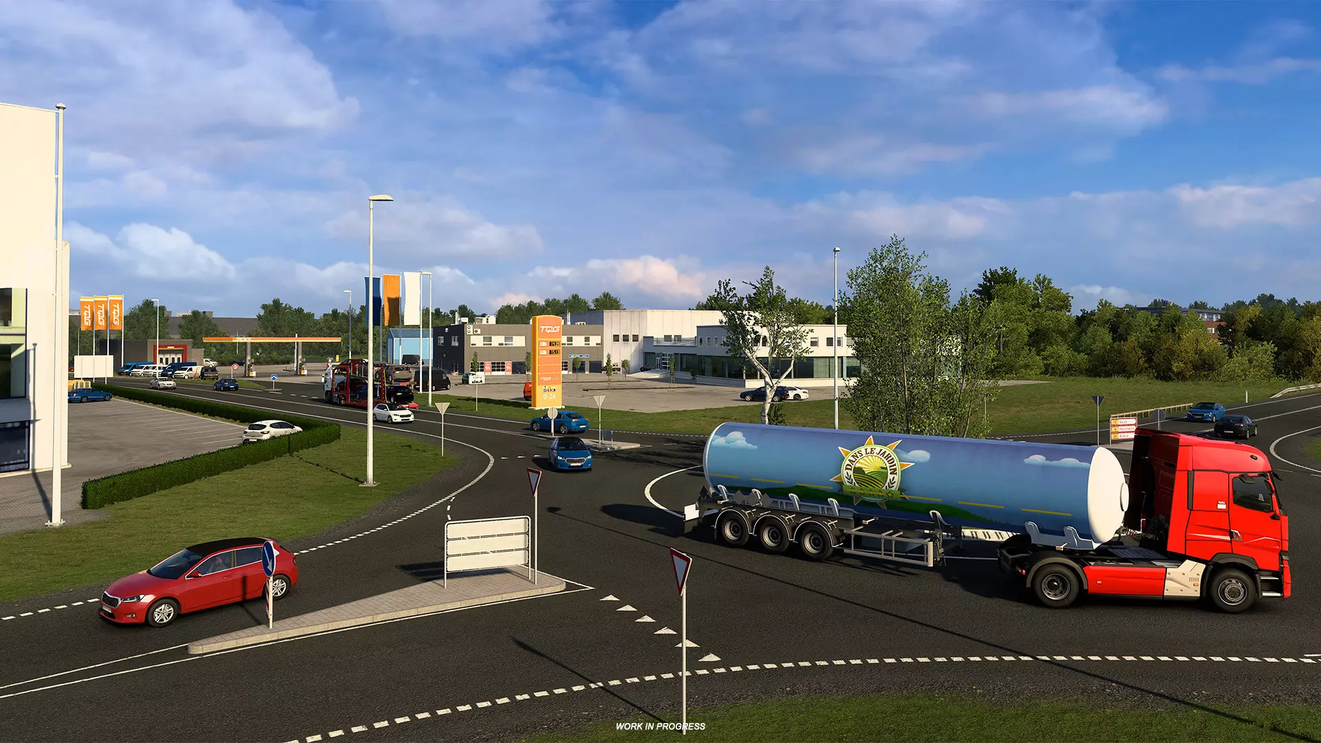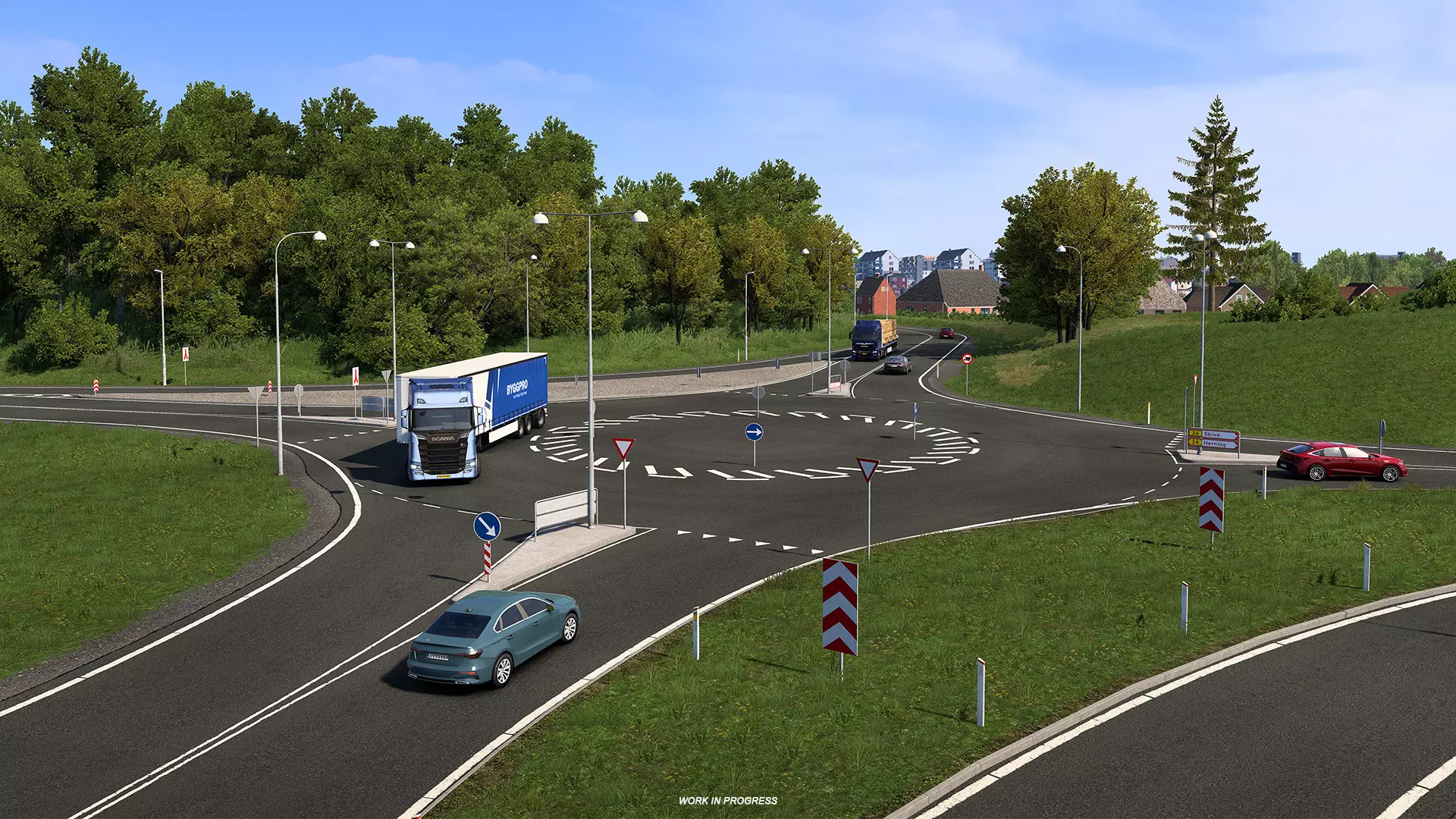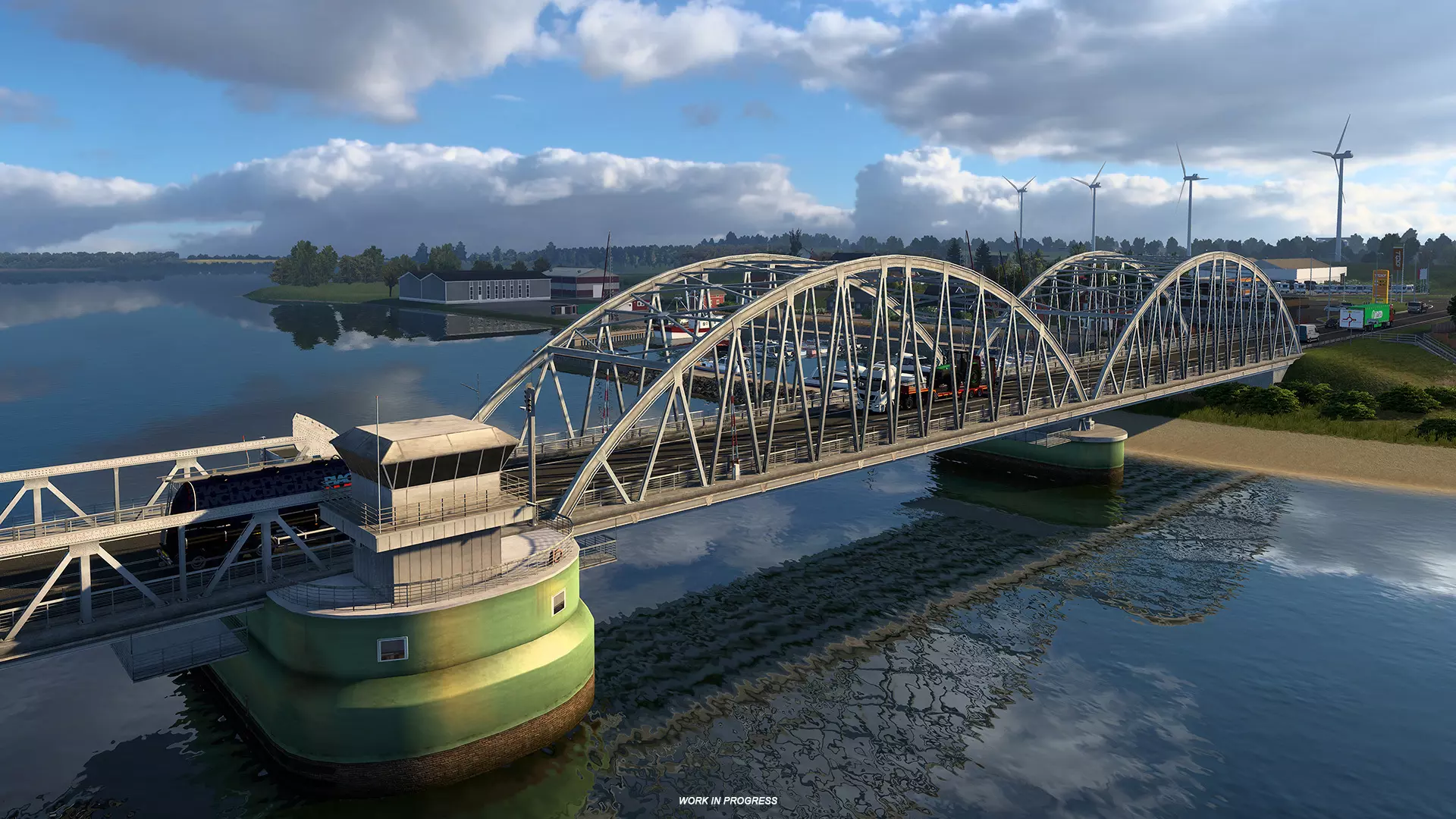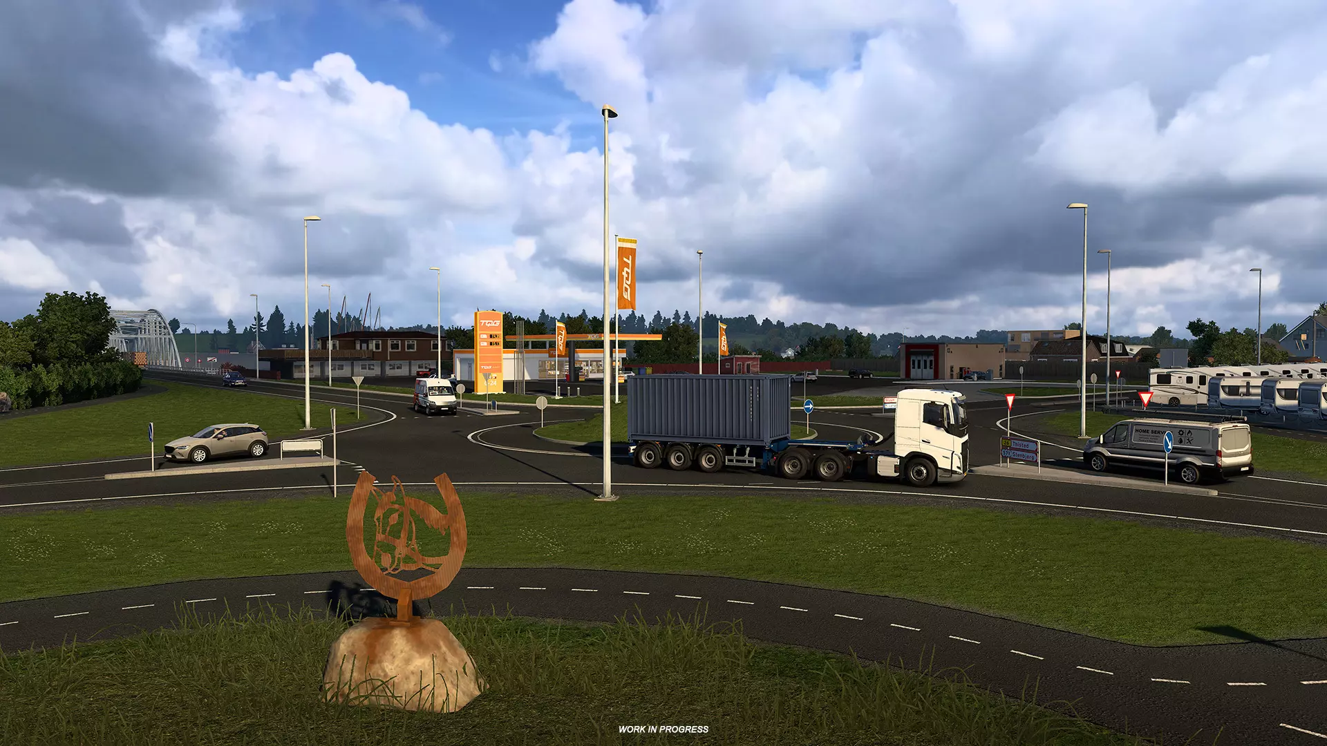 再往前,道路延伸至V. Vilsund,这里设有第二个新加油站。司机们还将驶过令人印象深刻的Vilsundbroen大桥。现实中,这是一座可开合的吊桥,偶尔会为过往船只开启。虽然在游戏版本中它是固定的,但我们仍自豪地将这一重要的地区地标呈现给玩家体验。