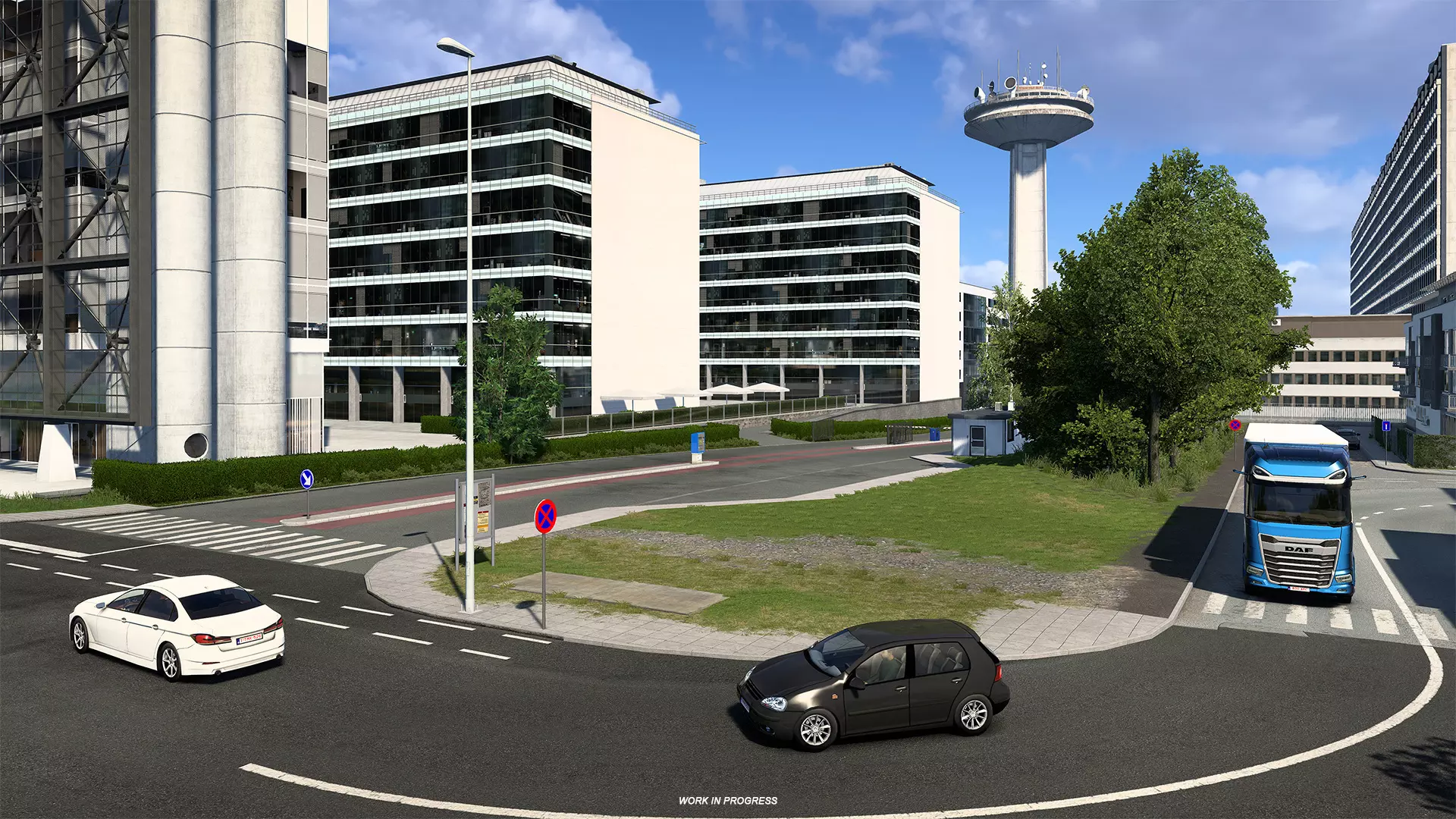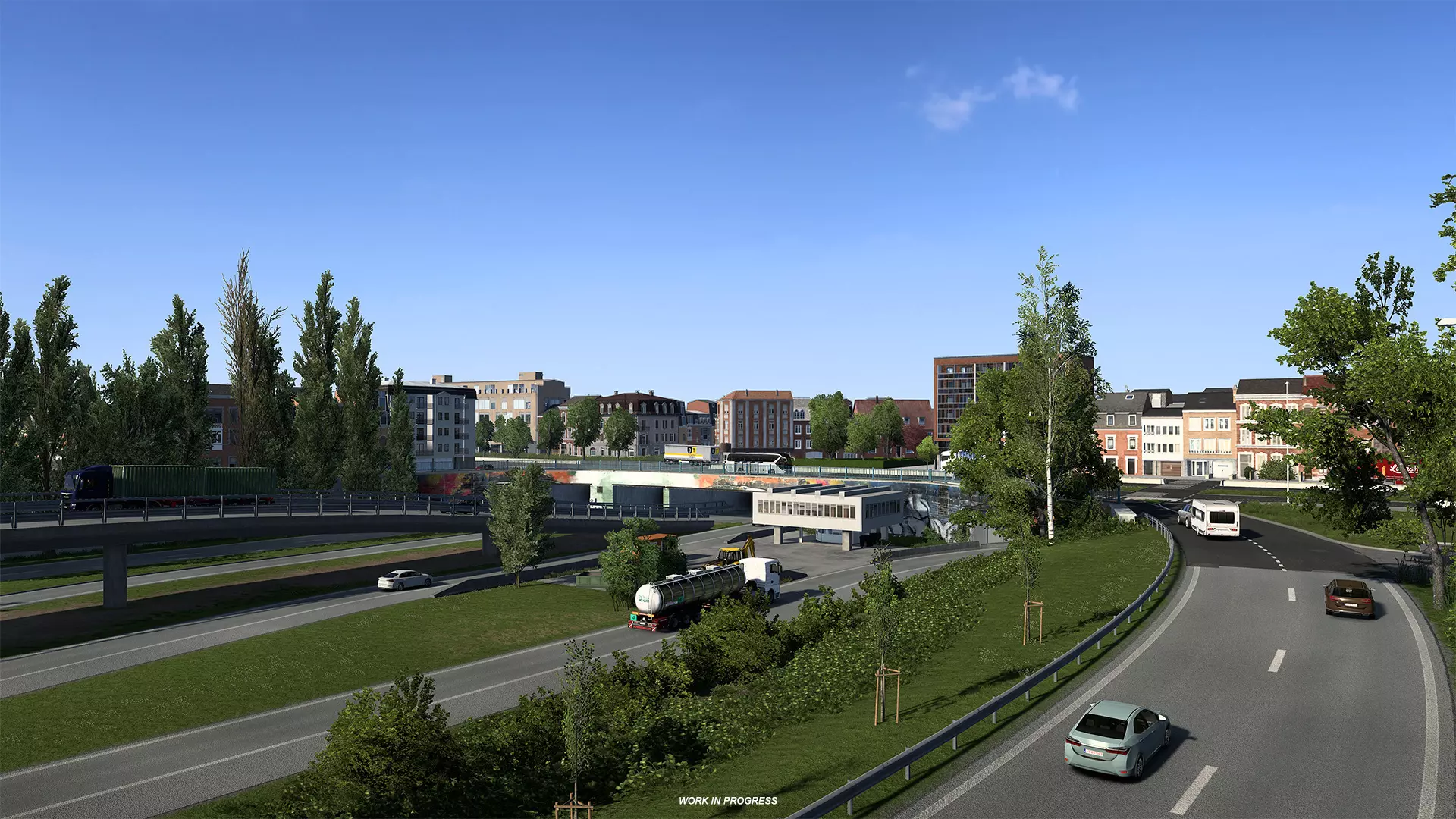 在比荷卢重制项目中,布鲁塞尔的核心部分是城市环线,其复杂的交叉路口位于该网络的中心。它连接着森林和安德莱赫特自治区的工业区——这里有一座汽车工厂、一座化工厂和一个物流中心——所有这些都将依赖你的服务来确保货物高效运输。你还将看到 Schaerbeek 自治区,在那里你的货物配送将为一个正在进行的建筑工地提供支持。