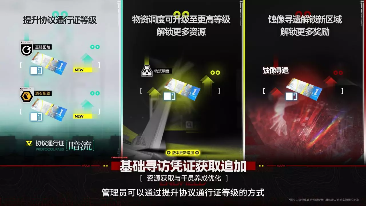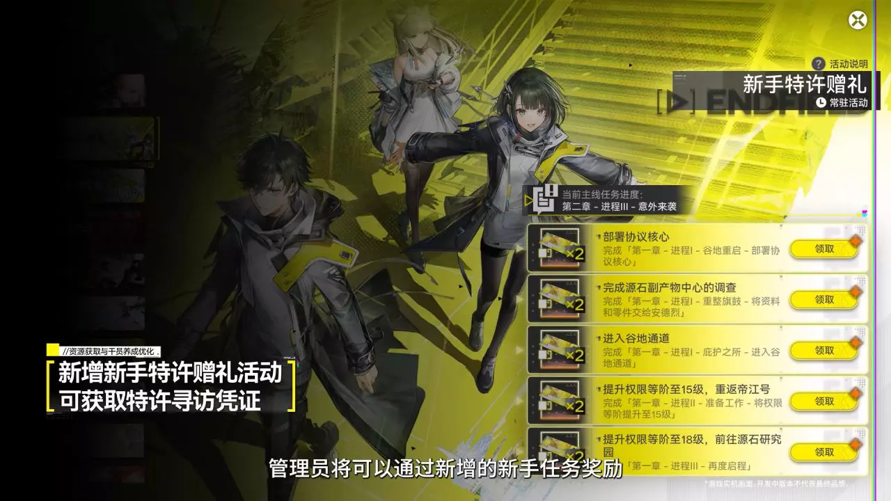 《明日方舟:终末地》优化进展与版本前瞻 嵌晶玉×1000(游戏内邮件发放) 折金票×10000(游戏内邮件发放) 初级认知载体×8(游戏内邮件发放) 武器检查套组×4(游戏内邮件发放) 新增新手特许赠礼活动,在完成主线第一章特定进度后,可累计获取10张特许寻访凭证(已达成的玩家可直接领取) 基础寻访凭证获取追加。提升协议通行证等级、物资调度可升级至更高等级、蚀像寻遗解锁新区域 首次获得4/5/6星干员,额外获得集成配额 上半六星近卫(物理) 洛茜,下半六星术师(冰) 汤汤 简化集成配额转换流程 四号谷地矿脉源区物资调度系统升至4级后,新增一个可用调度券购买的谷地多痕刻写箱 为可解锁新区域的任务增加提示 降低红点提示干扰,优化红点信息的出现频率 优化行动手册的部分任务 优化邮箱领取逻辑 新增部分剧情演出的跳过功能 优化邮箱暂存区(珍稀采集物可进入邮箱暂存区,且领取后可直接进入仓库) 简化「蚀像寻遗」进入挑战时的场景镜头 武器潜能升级与基质界面将支持直接查看武器技能详情 优化地图界面珍贵采集点对应材料的剩余数量展示 新增地图界面未插矿机或未正常开采矿点的提示标记 前往好友帝江号探索离开后,直接传送回原位置 优化种植体验,减少操作时间,增强施肥效果 优化敌人发起攻击时的提示效果 玩家可以以独立的全队满生命值、满终结技能量的状态挑战特定协议空间 设备可在集成核心区域外制造 优化放置设备描述提示 优化共享设备的管理方式,可通过地图界面操作删除 优化自建设备与共享设备的UI样式差分 新增搜索暂停时可以显示小地图和打开大地图的功能 PC端将可通过设置,在俯瞰模式下使用Esc按键或者CAPS-LOCK按键退出俯瞰模式 增加俯视模式下的最大可见范围 新增俯视模式下,手柄端长按按键可快捷移动设备的功能 增加电力运输超过80米后中断连接间的缓冲距离 剧情对话将不会打断电力运输 优化建筑物体的瓶子的一键存放逻辑 优化模拟空间手动完成状态的展示,新增模拟空间手动完成的相关蚀刻章 将在未来版本实装: 增加帝江号舱室的快捷收取产物并自动安排生产功能 增加帝江号会客室的快捷收取线索并自动放入线索功能 增加在满足一定条件后,资源站可被远程一键收取的功能 优化手柄体验,补充更完善的手柄自定义键位调整设置 新增装备批量制造,装备排序逻辑优化 基质排序逻辑优化