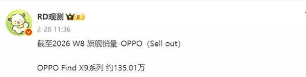 除此之外,RD观测还公布了OPPO Find X9系列与vivo X300系列的销量,前者约为135.01万台,而后者则是达到了165.05万台