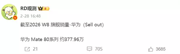 快科技3月1日消息,近日, 博主“RD观测”公布了2026年第八周国内旗舰手机销量数据,华为Mate 80系列累计销量达377.96万台,以0.13万台的优势反超了小米17系列的377.83万台。 华为Mate 80系列于2025年11月正式发布,截至此次数据统计,该系列开售时长为87天,同期销量远超华为上一代旗舰Mate 70系列。