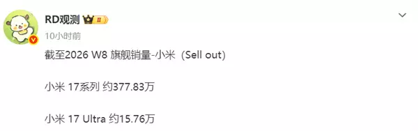 据悉,华为Mate 70系列开售88天的累计销量为280万台, Mate 80系列在更短的开售时间内实现了近100万台的销量增长。 此次统计中,小米17系列除整体销量377.83万台外,其Ultra版本单独销量为15.76万台。