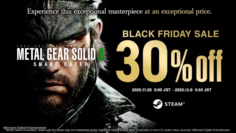 科乐美“黑色星期五促销”活动期间,《潜龙谍影Δ:食蛇者》标准版享7折优惠,活动持续至12月9日凌晨3点(日本时间)。 这部史诗作品讲述了传奇英雄“大首领”的诞生故事,也是《潜龙谍影》系列的起源。 其他游戏也在促销中,详情可查看相关页面。 科乐美发行商特卖2025正在进行中!