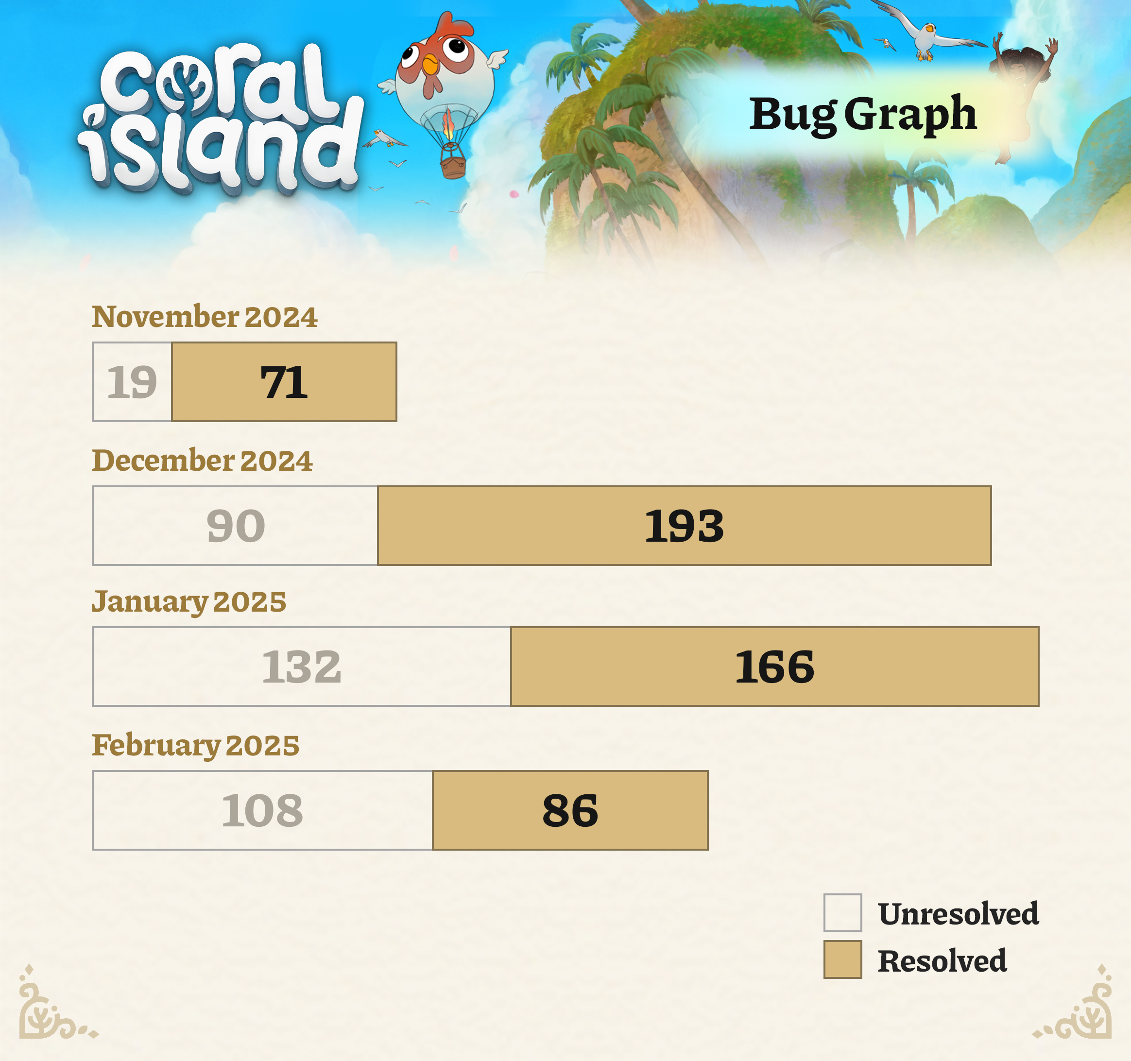 关于Switch平台的消息,目前我们还没有任何更新。相关讨论仍在进行中。但请放心,一旦有可以分享的内容,我们会立即通知大家!我们和大家一样渴望解决这个问题! 接下来 我们即将完成1.2版本更新!一旦完成QA测试、漏洞修复和最终本地化工作,我们将公布官方发布日期。之后,《珊瑚岛》开发团队将把重点转向1.3版本更新,该版本将带来: - 孩子成长系统 - 幽灵节的鬼屋小游戏 - 娱乐中心的新小游戏 - 人鱼节 - 以及更多内容!