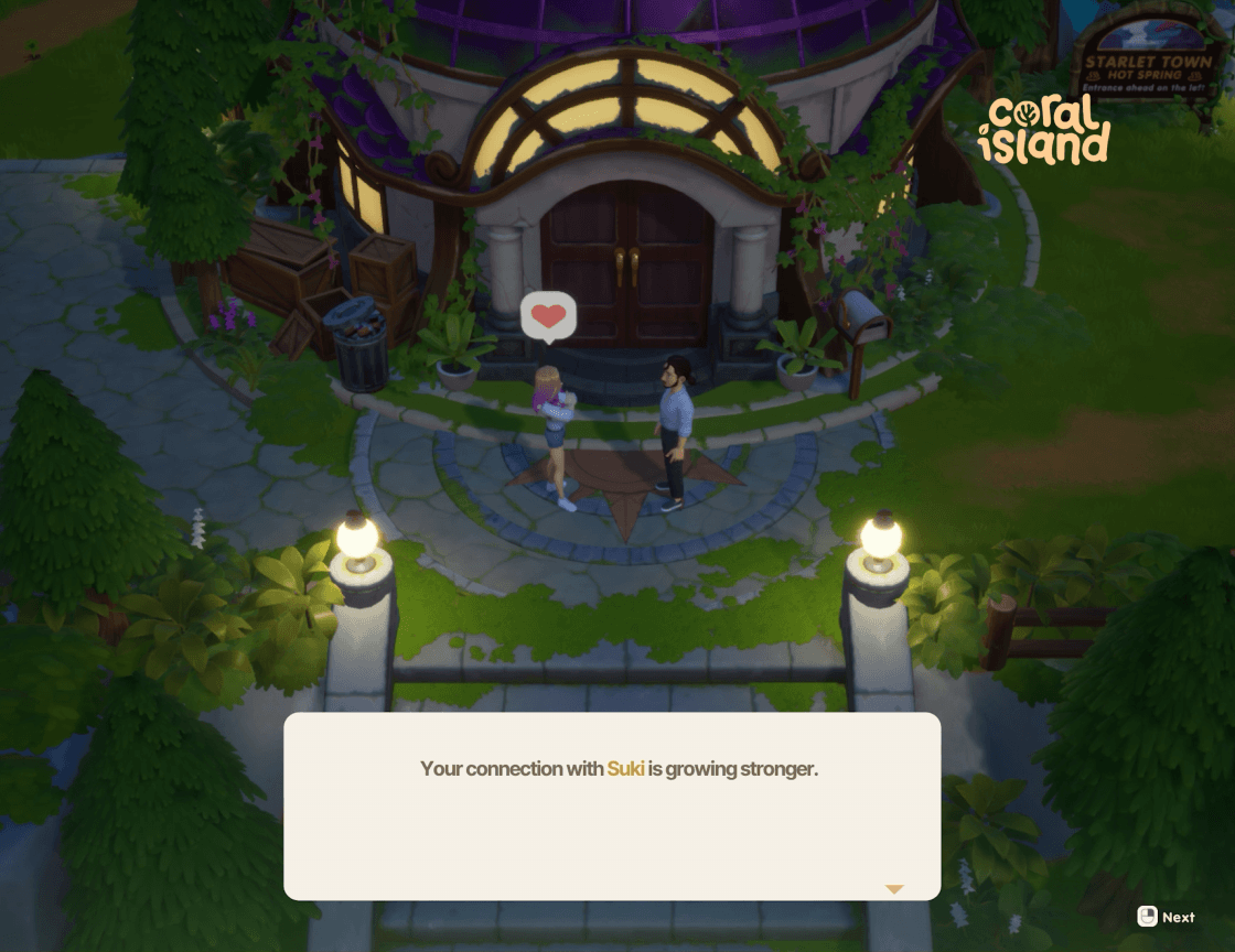 ### 《珊瑚岛》浪漫关系系统更新内容 1. **全新浪漫关系进展机制**:我们对《珊瑚岛》中的浪漫关系进行了改进,让你与可攻略角色的关系更具吸引力和意义,为这些关系增添新的深度和进展空间。 2. **新增心锁系统**:引入心锁系统以增加关系深度。你可以通过相关内容了解如何解锁心之等级并与心仪的岛民增进关系!游戏初始即可解锁0-5级心之等级。