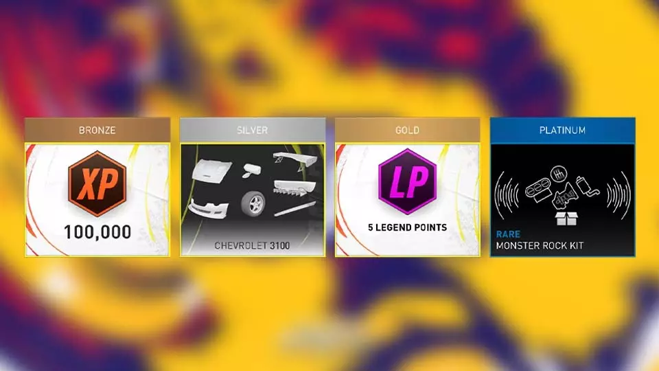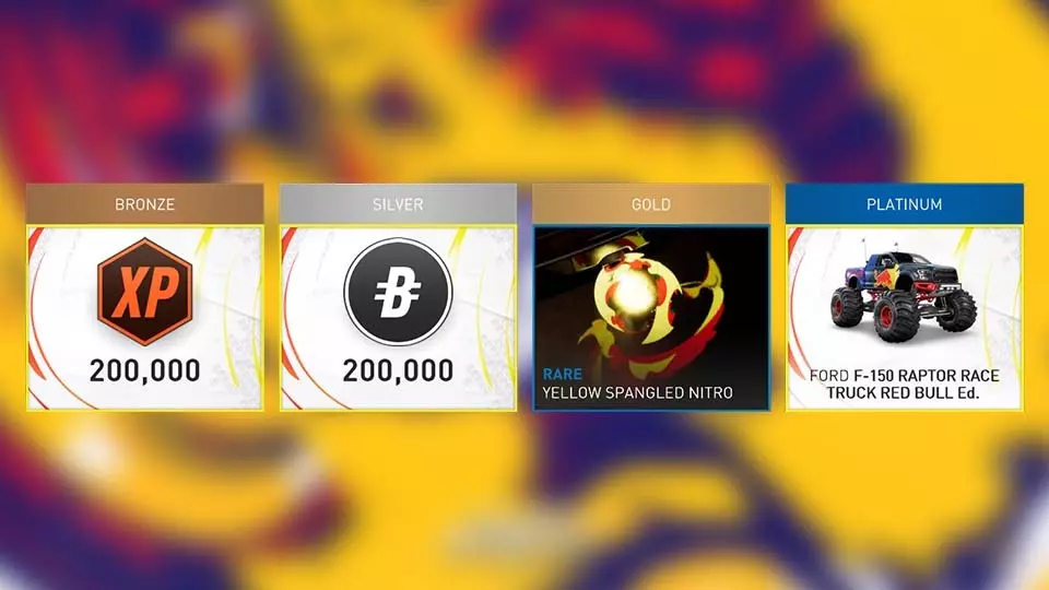 名称 活动 限制条件 Monster Tricks Daredevils 2 租借【福特F-150猛禽赛车红牛版】 Crater Arena Apex 2 Abarth 500 Monster Monstrous Homework Daredevils 6 Hombie High School Edition Duel at the Top Chase Silver 租借Proto Hup One Monster Destroyed Derby Chase Killjoy Proto Hup One Monster Goliath VS David Chase Shade Proto Hup One Monster Slalom Asphalt Monster Bullseye Escape Offroad大众 Kombi 高中版