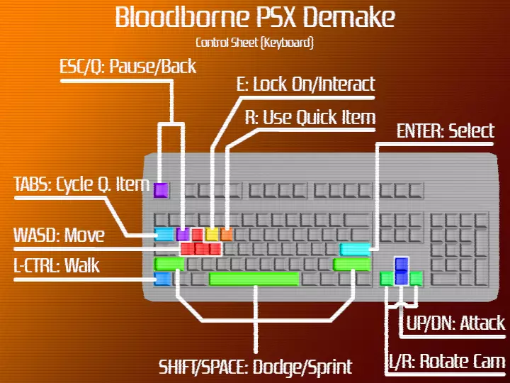 PC 控制: 移动:WASD 旋转视角:左右方向键 攻击 R:上方向键 攻击 L:下方向键 锁定/互动:E 使用快捷物品:R 切换快捷物品:Tab 闪避/冲刺(按住):空格键/左Shift 步行:左Ctrl 暂停/返回:Esc、Q 菜单导航:方向键 选择菜单选项:Enter