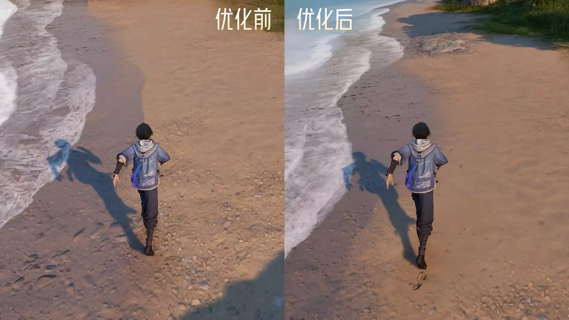 场景交互和角色肤质表现力也迎来了再次升级!水体层次感将更加丰富,海边的沙滩地面也新增了脚印效果;角色的皮肤材质也更加细腻真实,拍照出片更加得心应手!