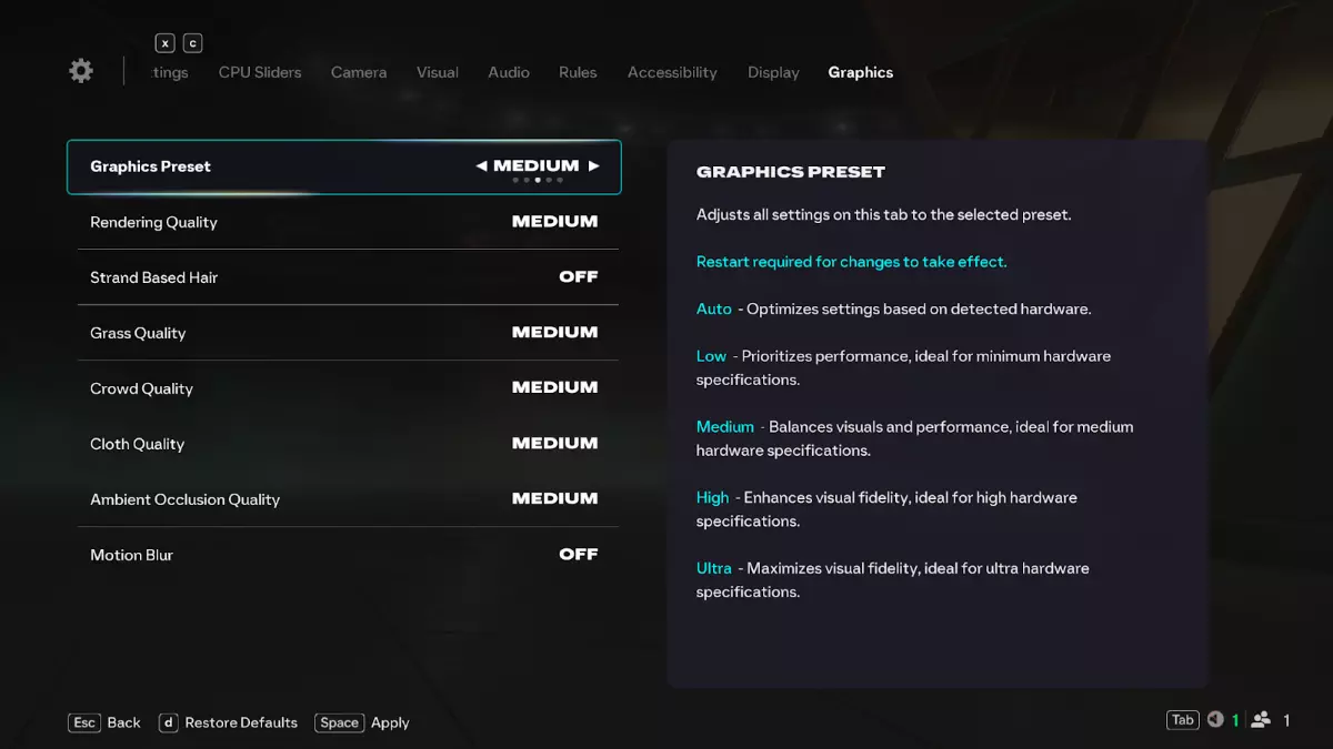 图形设置指南 更改图形设置后需要重启游戏才能生效。 图形预设(新增) 自动:针对您的硬件进行优化。 低:最适合最低配置的电脑。 中:视觉效果和性能的平衡。 高:为性能较强的电脑提供更高的画质。 超高:为顶级硬件提供最大细节。 画质设置 渲染质量:控制球员、体育场和物体的细节与光照。 CPU:高占用 GPU:高占用 VRAM:高占用 基于发丝的毛发:模拟单独的发丝。 CPU:中等占用 GPU:高占用 VRAM:低占用 布料质量:决定球衣的外观和物理效果。 CPU:高占用 GPU:中等占用 VRAM:低占用 环境光遮蔽质量:通过阴影增加深度和真实感。CPU:高占用 GPU:高占用 VRAM:中等占用 球场设置 草皮质量:控制球场细节。 CPU:低占用 GPU:中等占用 VRAM:低占用 观众质量:控制观众细节和动画。 CPU:中等占用 GPU:中等占用 VRAM:中等占用 画面特效 动态模糊:快速移动的物体产生轻微模糊效果。 CPU:低占用 GPU:低占用 VRAM:低占用