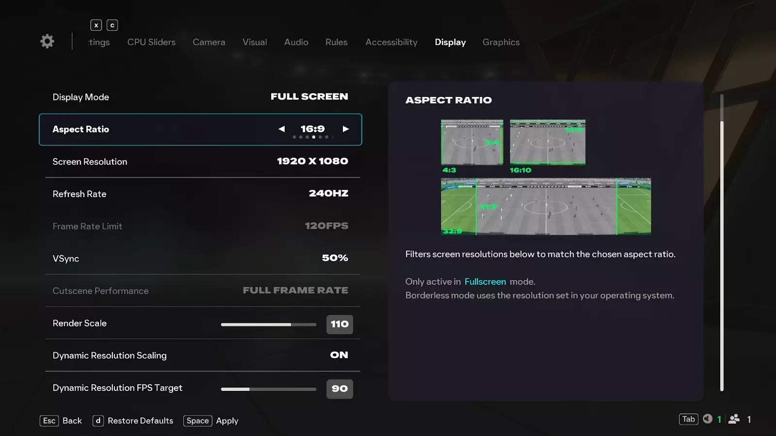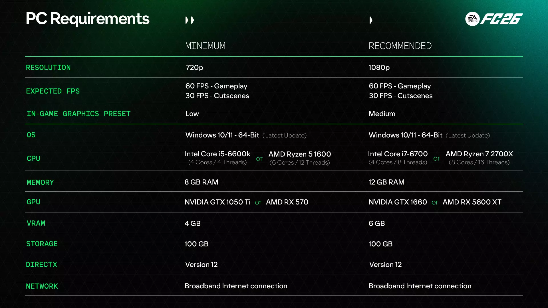 Hey everyone! In the PC Deep Dive Pitch Notes we’re diving into all the ways we’ve improved the PC experience for EA SPORTS FC 26. Thanks to your feedback, we’ve made foundational changes that give you more control, smoother performance, and clearer settings across the board. Here’s what we’ll cover: Controller Support Enhancements Expanded Display Settings Improved Graphics Settings Usability Display Settings Guide Graphics Settings Guide PC Requirements EA Javelin Anticheat Controller Support Enhancements We know many of you play on PC with controllers, and this year we’ve added more immersive support. DualShock®4 Support: Full vibration support when playing on PC with a USB connection. DualSense™ Controller Support: Includes haptics and adaptive triggers for a more immersive experience with a USB connection (basic vibration support over Bluetooth). Expanded Display Settings We’ve added more flexibility so you can fine tune FC 26 to match your setup and preferences. Active Monitor Selection: Choose which monitor you want to run the game on directly from in-game settings. Aspect Ratio Filter: Quickly find supported resolutions based on your display’s aspect ratio. More Frame Rate Limit Options: Frame rate limits now extend beyond 120 FPS, with support for 144, 165, and 240 FPS. More VSync Options: Sync your frame rate to a fraction of your monitor’s refresh rate (½, ⅓, ¼). Render Scale: Adjust resolution relative to your render setting, especially useful for windowed or borderless modes. Dynamic Resolution FPS Target: Set a performance target to trigger dynamic resolution scaling automatically. Improved Graphics Settings Usability We’ve worked to make PC graphics settings easier to understand and quicker to configure. Informative Settings Descriptions: Every graphics setting now includes descriptions and impact details on CPU, GPU, and VRAM usage. Graphics Quality Presets: Switch between predefined options like Low, Medium, High, Ultra, and Auto to adjust quality settings (restart required to take effect). Display Settings Guide Here’s a breakdown of key display settings, grouped for easier navigation. Screen Setup Active Monitor (NEW): Choose which monitor displays the game in Borderless or Full Screen. Display Mode: Borderless: Fills your screen without borders (cannot be resized). Fullscreen: Uses your entire screen. Windowed: Runs in a resizable, movable window. Aspect Ratio (NEW): Filters resolutions by chosen aspect ratio (Fullscreen only). Screen Resolution: Sets display resolution. Higher = sharper image, but lower performance (Fullscreen only). Borderless uses OS resolution. Tip: use Render Scale to adjust in Borderless. Frame Rate & Refresh Refresh Rate: Controls how often your monitor refreshes (Fullscreen only). Frame Rate Limit: Caps FPS when VSync is off. VSync: Syncs FPS to your monitor to prevent tearing. Off: No sync. On: Matches refresh rate. 50%, 33%, 25%: Syncs FPS to a fraction of refresh rate. [Example: On a 240Hz monitor → 120 FPS (50%), 80 FPS (33%), 60 FPS (25%). Cutscene Performance: Controls FPS in cutscenes, menus, replays, and set-piece cameras. Half Frame Rate: 50% of refresh rate or frame limit. Full Frame Rate: Matches your frame rate limit. Disabled when VSync is fractional. Scaling Tools Render Scale (NEW): Adjusts render resolution relative to screen resolution. Below 100% = better performance, less sharp Above 100% = sharper visuals, heavier GPU load. Dynamic Resolution Scaling (DRS): Lowers resolution dynamically to maintain FPS (GPU-limited only). Dynamic Resolution FPS Target: Set the FPS you want DRS to maintain. Example: Target 90 FPS → resolution scales in real time to stay near 90 FPS.