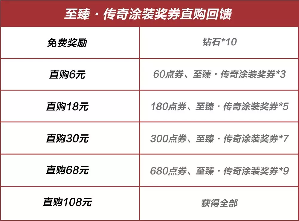 活动期间,参与活动可免费获取钻石*10,限时直购即可获得等额点券和至臻·传奇涂装奖券好礼。