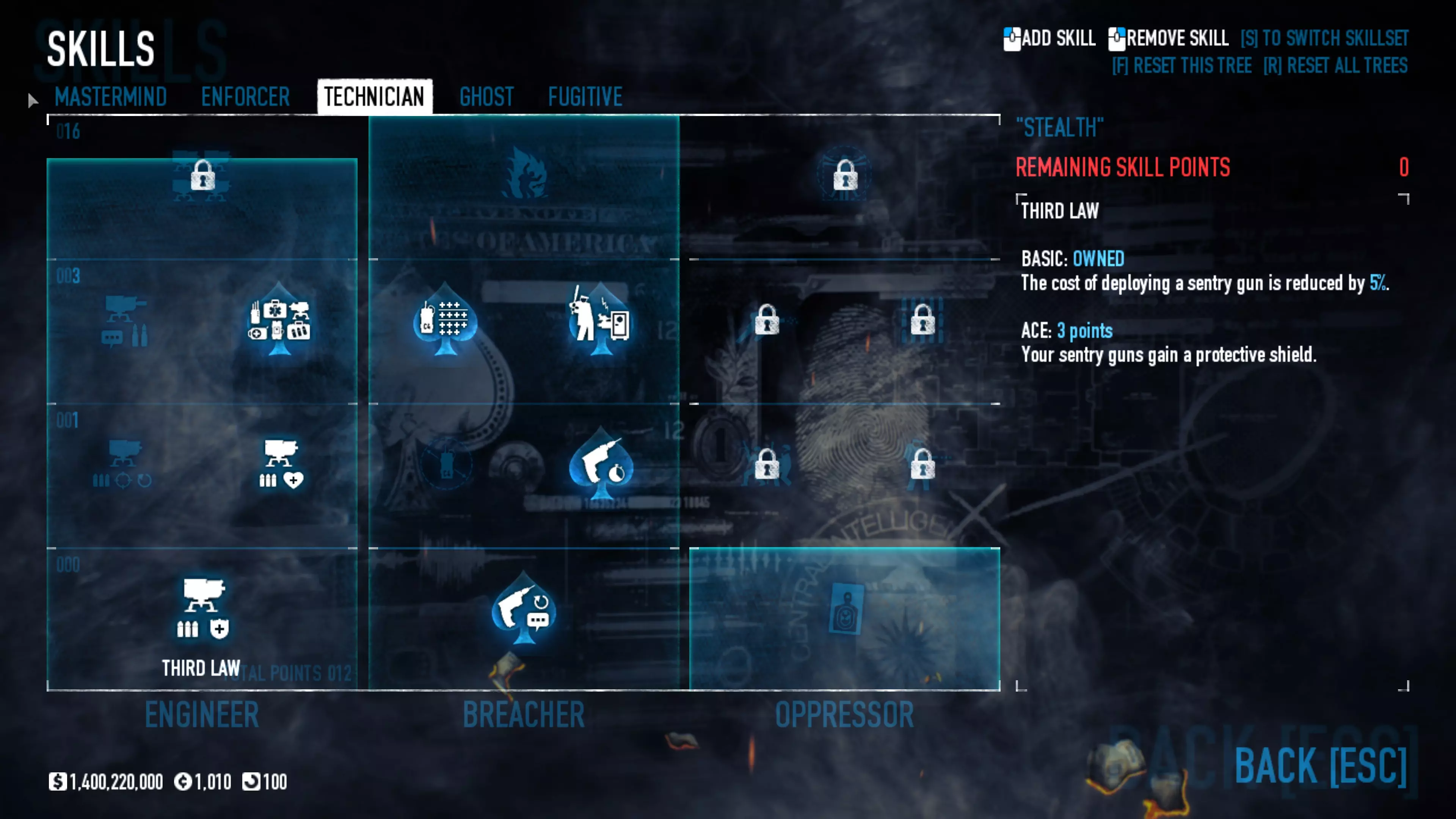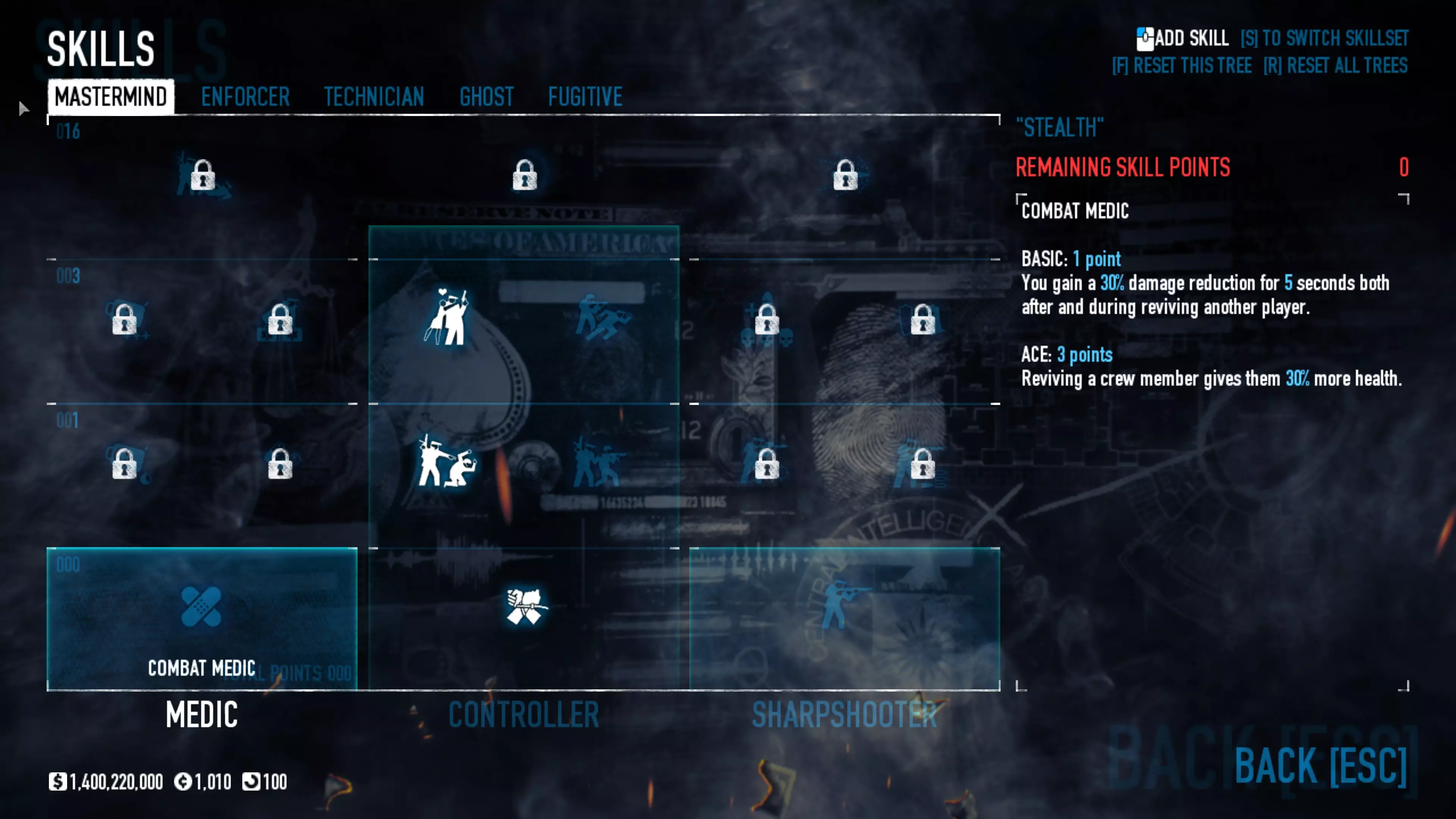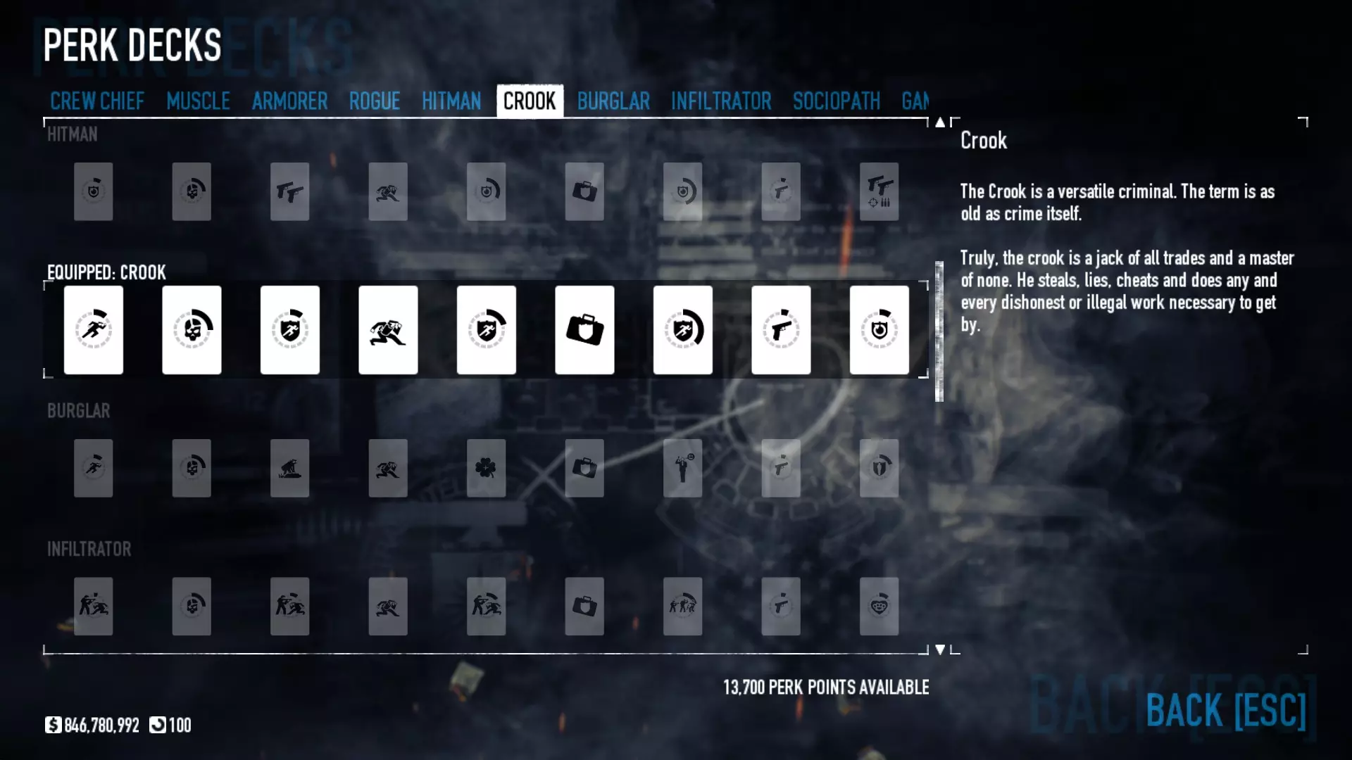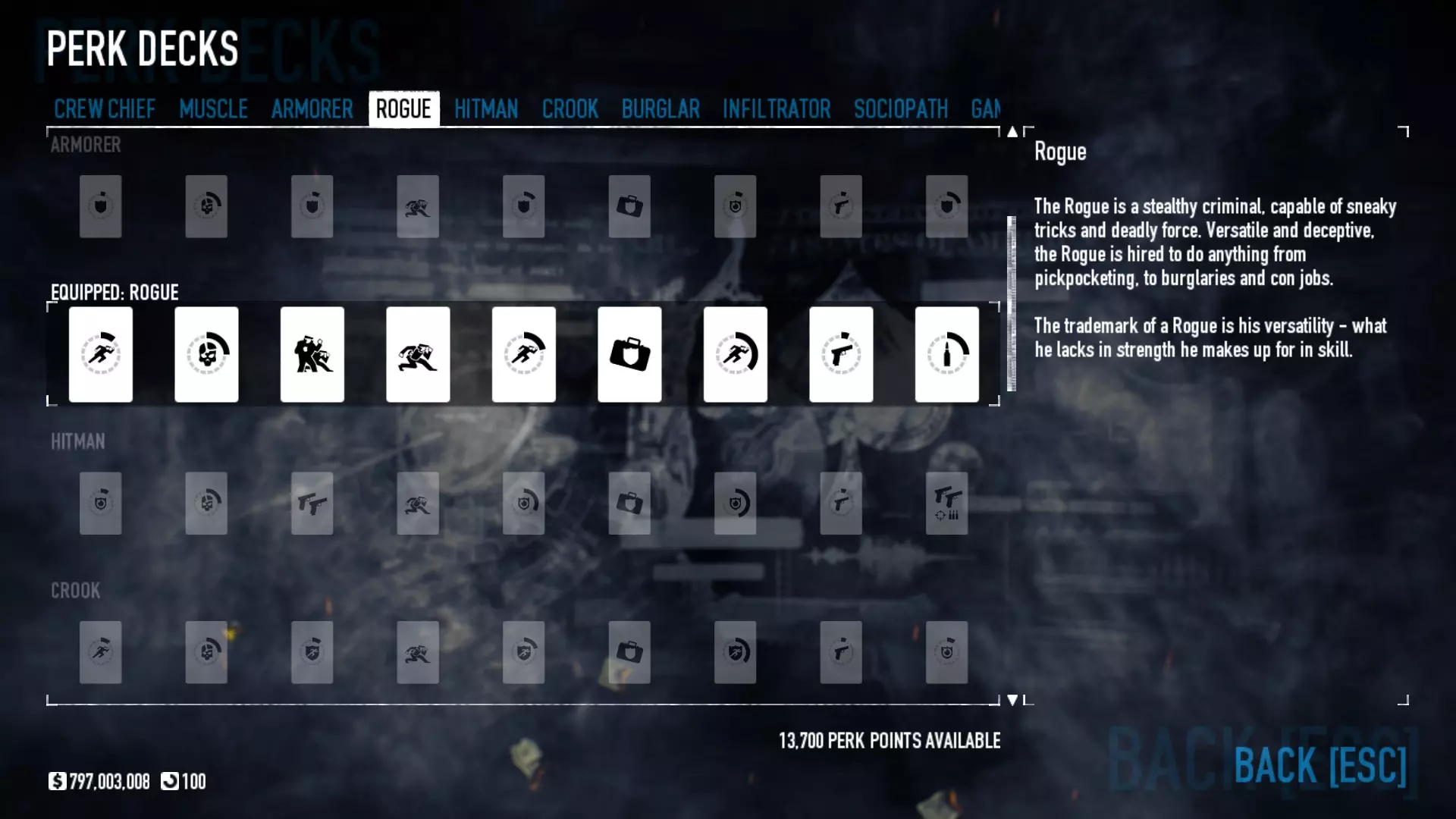 对于那些认为可以单枪匹马行动的玩家,这套配装能让你有更多独自生存的机会,但请记住,你仍然需要团队才能获胜。祝你好运。 备选技能与特长 潜行 【需要5级恶名等级】 逃犯-策划者 【需要5级恶名等级】 技师-策划者 【需要5级恶名等级】 执法者 【需要5级恶名等级】 策划者-执法者 【需要5级恶名等级】 保险箱、钻头与皮肤 一些老式保险箱需要购买钻头才能打开,而所有新保险箱(自2016年6月24日起掉落的)无需钻头即可打开。平均每周会获得一次安全掉落。要打开它们,只需启动游戏,然后在主菜单点击【Steam 库存】,点击安全箱即可开启并获得新皮肤。