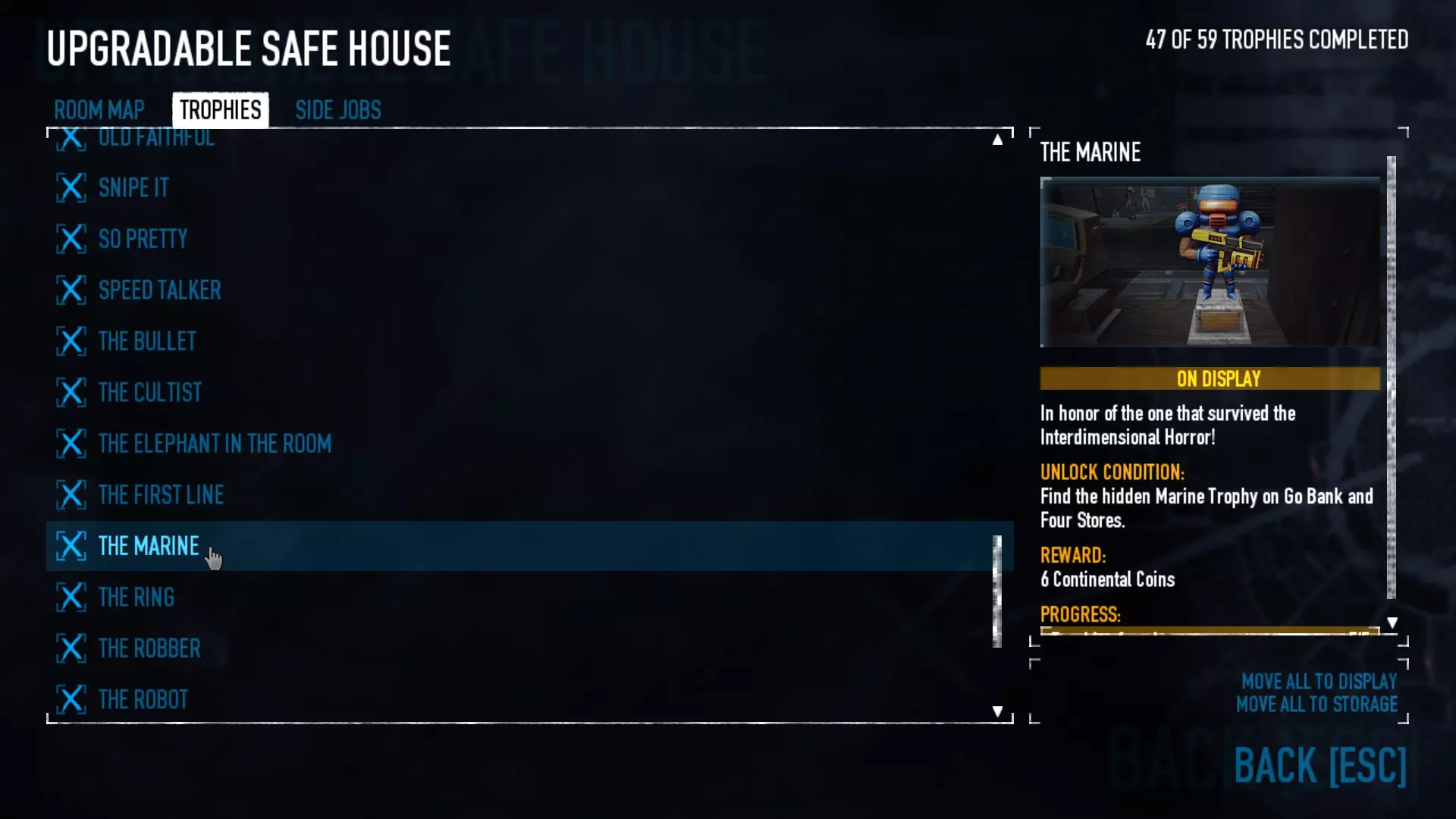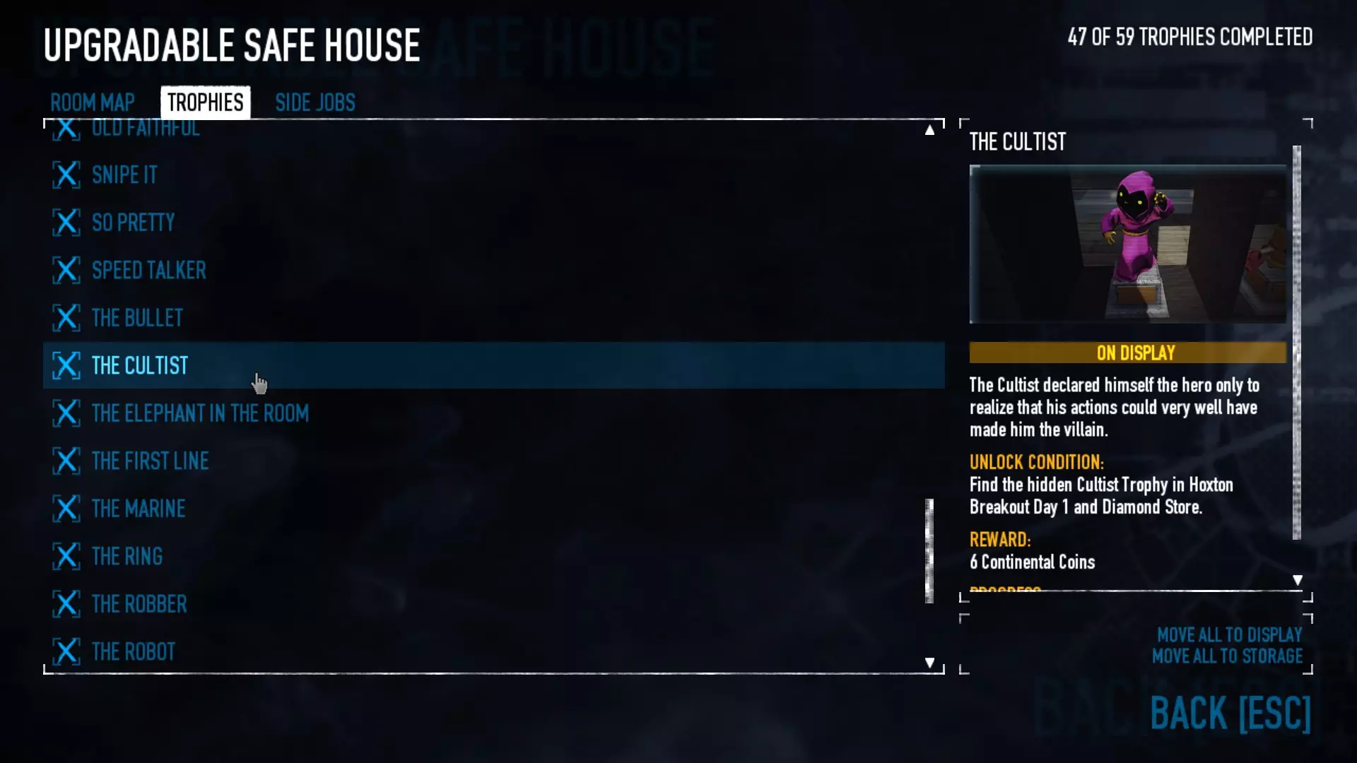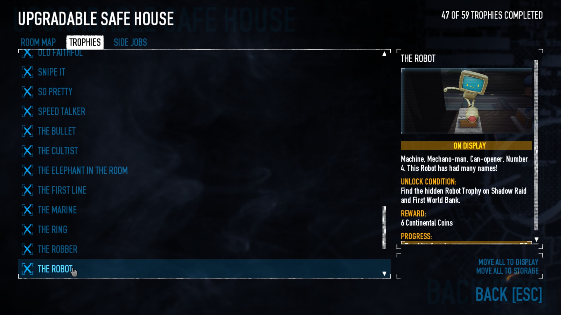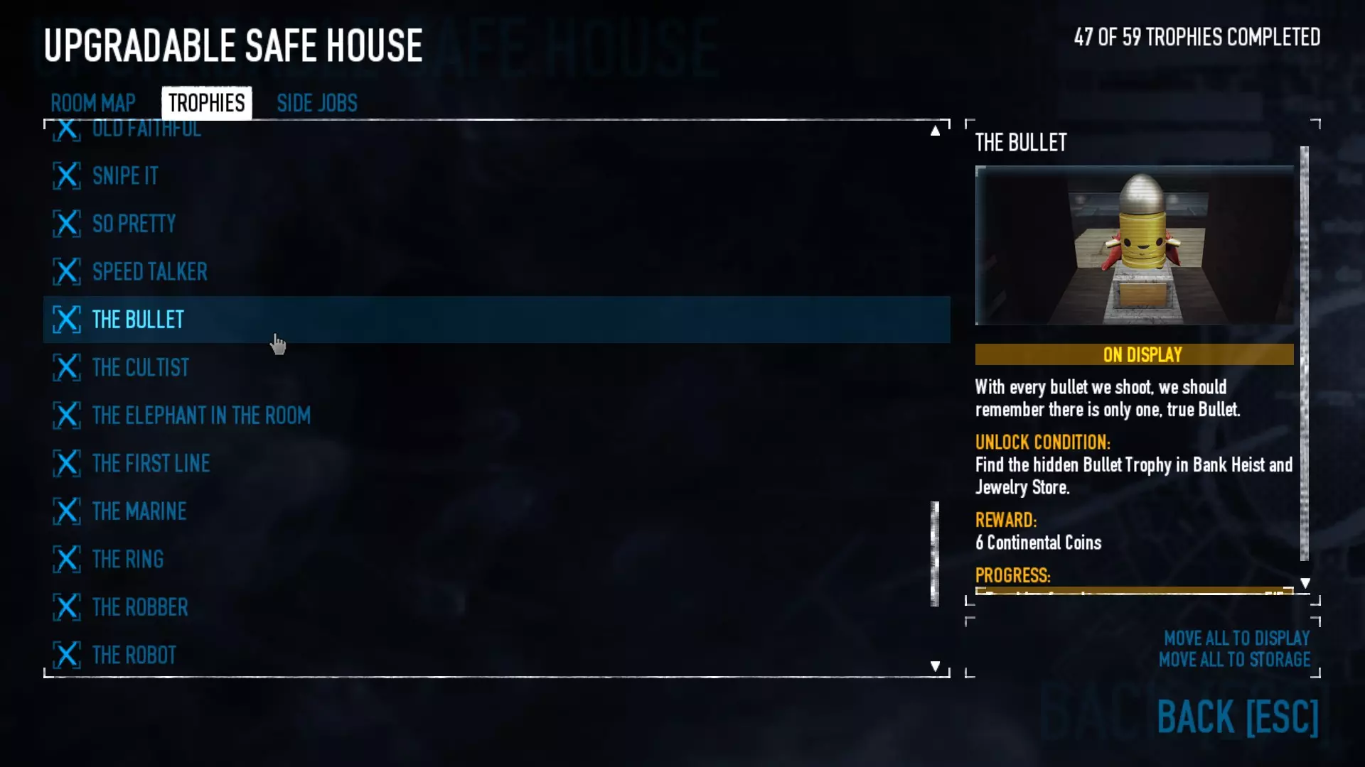 在【Panic Room】中完成【The Dentists Delight】成就,你需要找到超大号牙刷。它有很多可能的位置,从外面的垃圾桶后面到其中一间浴室里。这里有几个位置示例以及牙刷的样子。 在【GO Bank】中完成【Upside Down】成就,需要射击银行上方“Robert's Bank”招牌上的“T”字母。 【Side Jobs & Trophies】 【Old Bottle of Wine】:找到并不难,只需找到书架后面的酒窖即可。