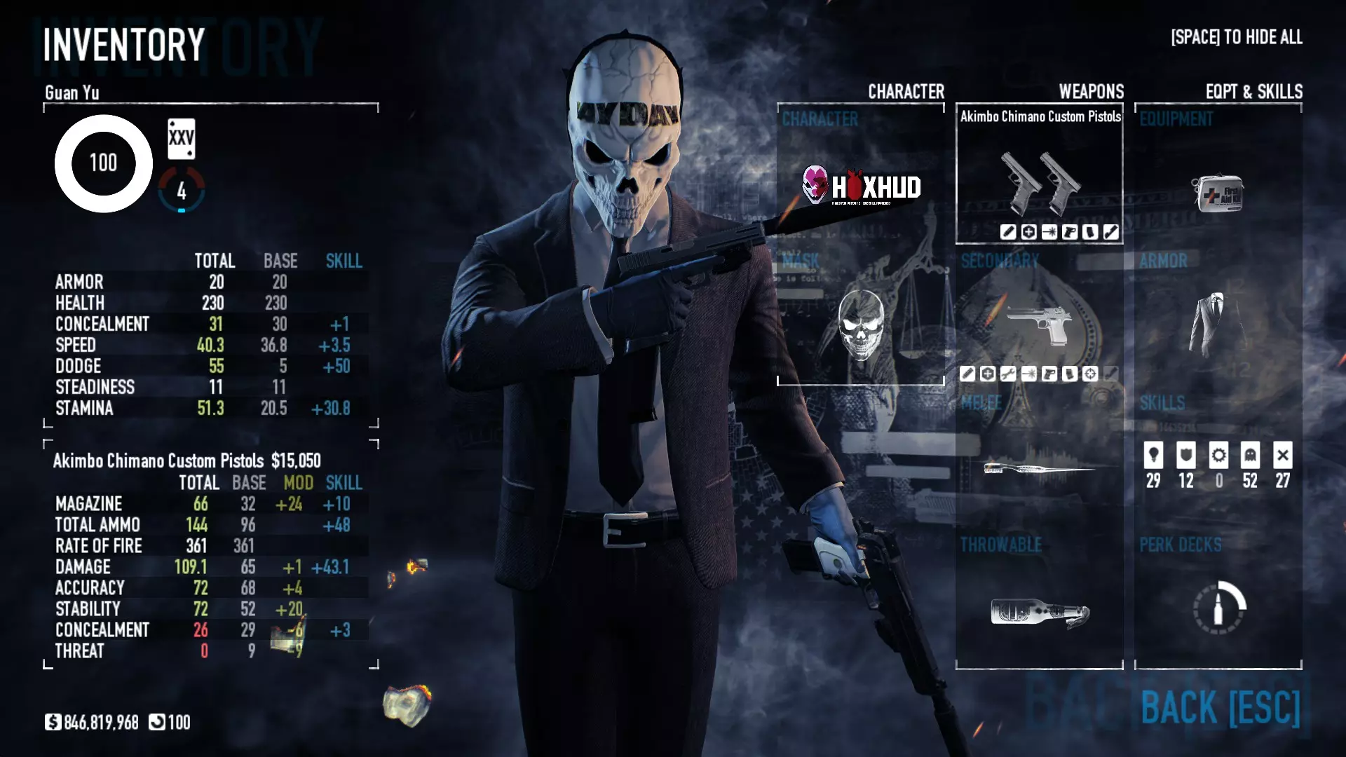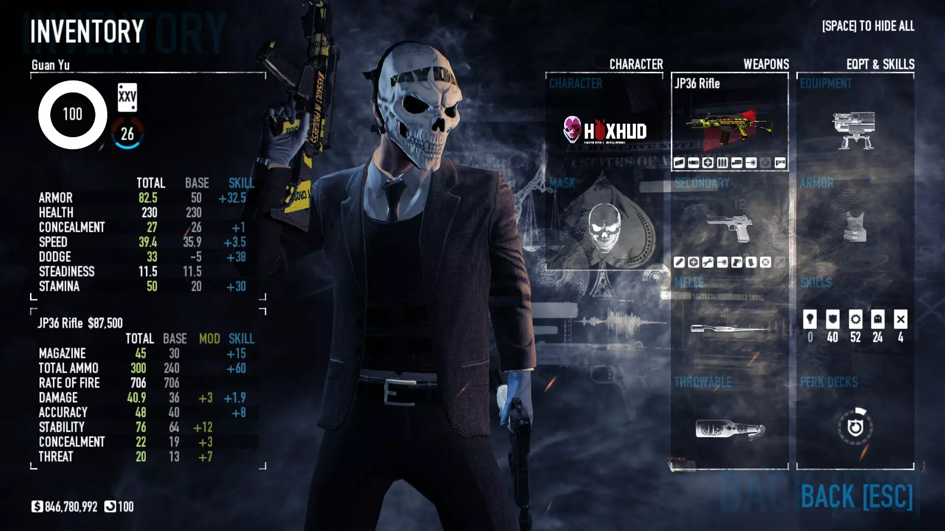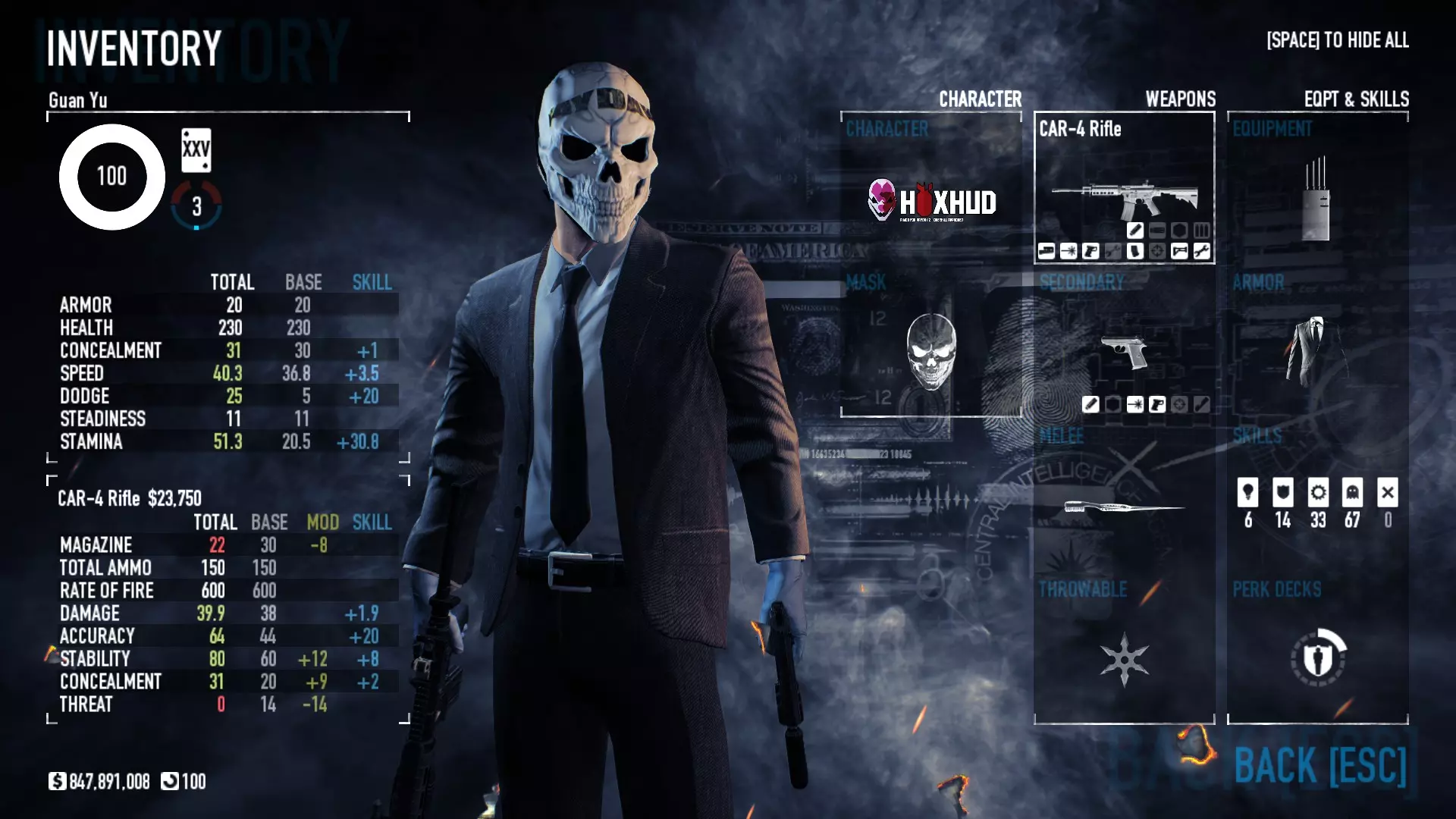 大陆币与犯罪狂欢 大陆币 大陆币是一种特殊货币,可通过完成劫案、支线任务、成就和犯罪狂欢获得。你可以用它们升级安全屋的房间,为AI队友配备各种能力,以及重新加入已“暂停”的犯罪狂欢。 犯罪狂欢 犯罪狂欢是一种在一个游戏进程中获得更多 payday(即结束时翻的卡片)的方式。例如,一次普通劫案会获得一次 payday 奖励。在犯罪狂欢期间,当你达到更高等级并激活更多功能后,一次劫案可以获得约8次 payday。我曾玩到犯罪狂欢324级(约20个任务),获得了300多个 payday 物品。确保犯罪狂欢的房主拥有最高的【犯罪狂欢等级】,否则其他人在等级达到或低于房主等级之前无法获得任何奖励。 你需要从三个随机生成的地图中选择一个,完成该劫案后,再从接下来生成的三个劫案中选择一个,以此类推,尽可能长时间地持续下去。 犯罪狂欢有一个不可更改的标准难度,你可以通过激活突变体来增加难度。激活的突变体越多,劫案难度就越大,但每个劫案获得的奖励也会越多。 一旦你领取奖励,犯罪狂欢就会结束,你需要从0级重新开始。如果你“暂停”犯罪狂欢,重新启动将消耗“大陆币”。暂停次数越多、犯罪狂欢等级越高,所需消耗的大陆币就越多(且可能消耗巨大)。我在324级暂停了犯罪狂欢,重新加入需要162个大陆币。 大多数只能通过犯罪狂欢获得的防弹衣皮肤,需要达到特定里程碑才能解锁部分皮肤。 属性 角色 护甲(最低20 - 最高280.5):护甲是你在生命值开始减少前能承受的伤害量,其恢复速度取决于你装备的技能和专长。生命值(最低230 - 最高414):一旦护甲消失,受到的额外攻击将开始降低生命值。当生命值耗尽时,你会进入【倒地】状态,需要队友复活你。 隐蔽值(最低0 - 最高31):即你的被侦测等级。隐蔽值越高,被侦测度越低。(被侦测度指警卫发现你的能力) 被侦测度(最低3 - 最高75):指警卫发现你的能力。被侦测度越低,警卫发现你之前的时间就越长。 移动速度(最低20.1 - 最高40.3):基本上就是你跑动的速度。装备护甲和重型武器会大幅降低移动速度。闪避(最低0 - 最高55):闪避等级越高,敌人攻击落空的几率越大。根据装备的技能和特长,在游戏中蹲下或奔跑时,闪避等级会进一步提升。 稳定度(最低11 - 最高无上限):决定被击中时的退缩程度,稳定度越高,退缩幅度越小。 耐力(最低14 - 最高51.3):耐力越高,奔跑至气喘吁吁前的持续时间越长,步行数秒后耐力会恢复。