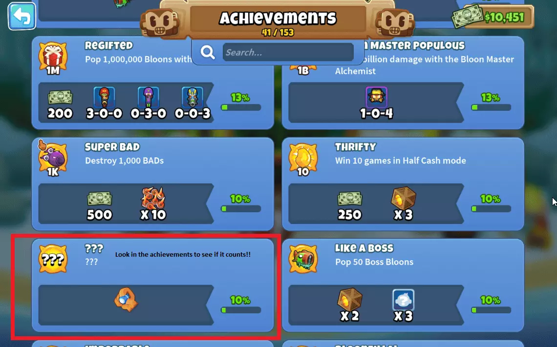 这并非专业指南,但会简要介绍我获取成就的方法,包括相关技巧和所需条件。内容会随着我遇到的成就逐步撰写。 所有技巧的原始来源都会注明。可以将本指南视为我整理的其他来源信息合集。 隐藏成就 - 第一部分 在游戏中,隐藏成就是一类特殊成就,其获取条件不会向玩家显示。通常需要通过好奇心探索或偶然发现才能解锁。——气球塔防维基(Bloons Fandom Wiki) 目前共有14个隐藏成就。黄金票:进入糖果瀑布区域,与隐藏的猴子互动并按特定顺序点击全部八只猴子来完成它们的歌曲,即可获得黄金票。需要快速按正确顺序点击猴子,大约1.0秒无操作后,顺序模式将重置。点击正确位置时,隐藏的猴子会出现然后消失。