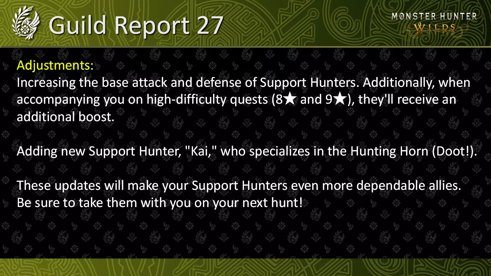 公会报告27 - 9月8日 - 支援猎人强化及TU3新增支援猎人 作为我们持续改进工作的一部分,我们想分享即将在2025年9月底发布的标题更新3(TU3)中对支援猎人的以下调整。 调整内容: 1. 提升支援猎人的基础攻击和防御力。此外,当他们陪同你执行高难度任务(8星和9星)时,还将获得额外加成。 2. 新增支援猎人“凯”,他擅长使用狩猎笛(嘟嘟!)。 这些更新将使你的支援猎人成为更可靠的盟友。下次狩猎时一定要带上他们!
