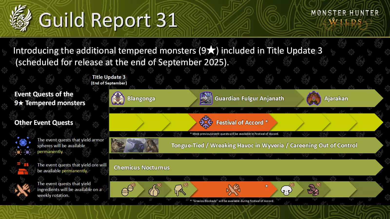 今年六月,我们推出了“公会报告”,这是一种基于社区反馈,让大家了解开发团队正在进行和已完成工作的新方式。 自那时起,我们已在《怪物猎人》官方推特/X账号发布了31篇公会报告,内容涵盖新内容、武器平衡调整、便利性优化、漏洞修复、游戏稳定性等多个方面。 由于这些报告发布频率较高,为避免频繁推送通知打扰大家,我们并未将其发布到Steam平台,而是通过《怪物猎人:荒野》总监德田优也的“总监信函”,定期向大家提供更全面的更新内容。不过,这些公会报告中包含了许多相当酷且最新的信息,所以我们想告诉大家,你们可以在我们官方网站的一个专门网页上找到我们迄今为止发布的每一份公会报告。 公会报告中心 我们将在下方分享一些最近的帖子,给大家举几个例子,让你们了解能看到什么内容! 近期公会报告 公会报告31 - 9月19日 - TU3中的全新9★历战怪物 作为我们持续改进工作的一部分,我们将在3.0版本更新(计划于2025年9月底发布)中引入额外的历战怪物(9★)。 调整: 将添加9★历战版雪狮子王、狱狼龙和熔翁龙,作为轮换的活动任务!奖励包括发光石、重铠玉和历战王宝珠等道具。 面对这些怪物的9星历战个体将带来全新的挑战难度。如果你有胆量,就去挑战它们吧!此外,不要错过各种其他活动任务和季节性活动。