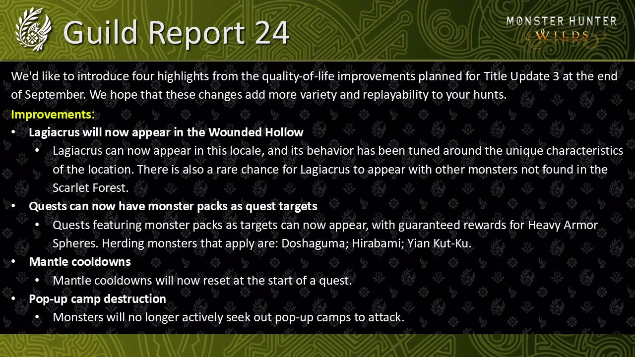 公会报告24 - 8月22日 - 伤 hollow 的水龙、怪物群狩猎及更多内容! 我们想介绍计划于9月底推出的第三次标题更新中四项生活质量改进亮点。希望这些变化能为您的狩猎增添更多多样性和重玩价值。 1. 水龙现在将出现在伤 hollow 水龙现在可以出现在该区域,其行为已根据该地点的独特特征进行了调整。水龙还有很小的几率与猩红森林中未出现的其他怪物一同出现。 2. 任务现在可以将怪物群作为任务目标 现在可以出现以怪物群为目标的任务,并保证获得重铠玉奖励。适用的引导怪物包括:多沙熊兽、绯鲛、大怪鸟。 3. mantle冷却时间 mantle冷却时间将在任务开始时重置。 4. 临时营地破坏 怪物将不再主动寻找临时营地进行攻击。 开发团队致力于倾听玩家反馈,并对《怪物猎人:荒野》进行进一步改进。感谢您的支持!