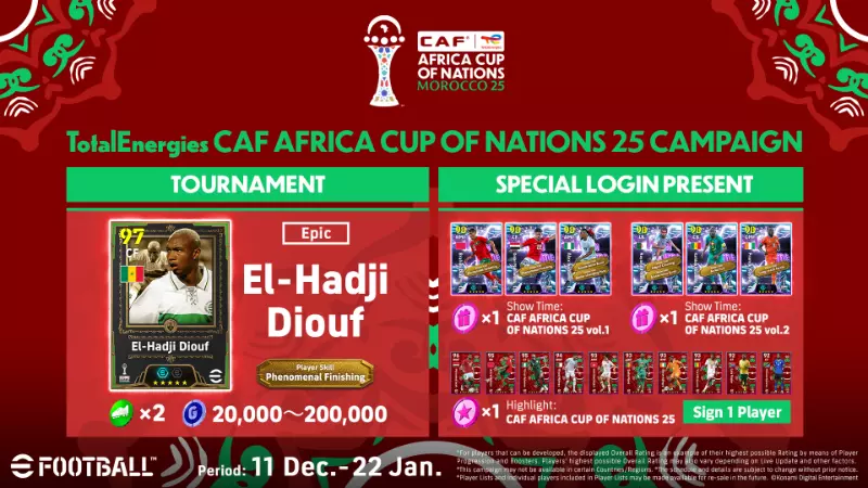 为庆祝《CAF AFRICA CUP OF NATIONS MOROCCO 25》的推出,我们将举办特别活动。 你可以获得参赛国家的球员作为奖励,并参与以该赛事为主题的活动! 当非洲劲旅在激烈的比赛中交锋时,也在《实况足球》中体验这份激情吧! 拥有特别卡片设计的球员作为奖励 活动期间登录,即可领取精选合同作为登录奖励! 奖励发放时间 2025年12月11日02:00(UTC)-2026年1月22日01:59(UTC) 奖励详情 ・【亮点:CAF AFRICA CUP OF NATIONS 25】精选合同×1 *奖励将从你领取之日起保留在收件箱中,直至2026年1月22日01:59(UTC)。免费机会礼包 活动期间登录即可领取机会礼包作为登录奖励。 礼包发放时间 2025年12月11日02:00(UTC)-2025年12月29日01:59(UTC) 礼包详情 ・【表演时刻:2025年非洲国家杯 第一卷】机会礼包 x1 ・【表演时刻:2025年非洲国家杯 第二卷】机会礼包 x1 *礼包将在领取当日起保留在收件箱中,直至2025年12月29日01:59(UTC)。 锦标赛活动 2025年非洲国家杯 活动时间 2025年12月11日02:00(UTC)-2026年1月22日01:59(UTC) 参与以2025年摩洛哥非洲国家杯为灵感设计的锦标赛活动,与AI进行对战! 完成联赛阶段即可晋级淘汰赛阶段。 选择一支国家队,踢出精彩足球,向着非洲冠军发起冲击!注意事项 *日程安排及相关细节可能会在不事先通知的情况下发生变更。