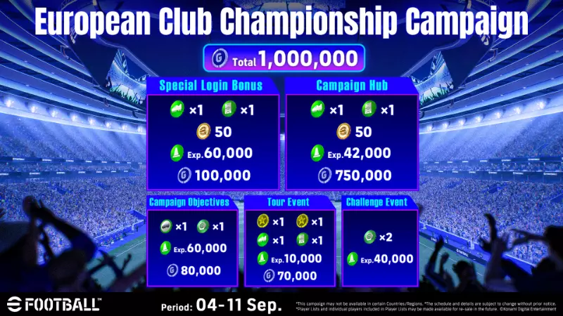 一场决定欧洲最佳俱乐部的盛大赛事刚刚拉开帷幕。 我们也将加入这场盛会,推出特别活动! 《efootball™》同样是欧洲最强球队之间展开激动人心对决的舞台! 活动中心 在指定期间内,通过参与PvP或VS AI比赛并前进一定数量的格子,即可在活动中心获取奖励。(友谊赛、训练或技能提升模式的任何进度均不适用。) 完成比赛并赢取奖励,进一步强化你的梦之队! 活动时间 2025年04月09日02:00(UTC)-2025年09月18日01:59(UTC) 前进20个格子可获得以下奖励: ・位置代币x1 ・随机技能代币x1 ・50 eFootball™金币 ・42,000经验值特殊登录奖励 活动期间持续登录,可累计获得以下奖励! 活动时间 2025年9月4日 02:00(UTC)- 2025年9月18日 01:59(UTC) *登录奖励每日02:00(UTC)刷新 奖励内容 ・位置代币 x1 ・随机技能代币 x1 ・50 eFootball™ 金币 ・60,000 经验值 ・100,000 GP 活动目标:欧洲俱乐部锦标赛 参与指定活动和eFootball™ 联赛,完成所有目标! 活动时间 2025年9月4日 02:00(UTC)- 2025年9月18日 01:59(UTC) 该目标将于2025年9月11日 02:00(UTC)添加。 新增挑战后,即可完成所有目标。 完成所有挑战可累计获得以下奖励: ・高级技能代币 x1 ・随机技能代币 x1 ・60,000 经验值・80,000 GP 查看各个独立目标以了解完成条件和奖励。 *查看目标的方法:进入【主页】>【任务】。 特别巡回活动 欧洲俱乐部锦标赛 与AI对战时收集活动点数即可获得奖励。 活动时间 2025年9月4日02:00(UTC)-2025年9月18日01:59(UTC) 累计6,000点可获得以下奖励: ・5★提名合同×1 ・4★提名合同×1 ・位置代币×1 ・随机技能代币×1 ・10,000经验值 ・70,000 GP *参与方法:进入【主页】>【比赛】>【活动 - 对战AI】。 特别挑战活动 3分钟比赛 参与比赛时长仅为3分钟的活动。 在PvP对战中完成挑战即可获得奖励。活动时间 第一阶段:2025年9月4日02:00(UTC)-2025年9月11日01:59(UTC) 第二阶段:2025年9月11日02:00(UTC)-2025年9月18日01:59(UTC) 奖励 ・随机强化代币 x1 ・20,000经验值 参与方式:前往【首页】>【匹配】>【活动-PvP】 使用GP兑换超值物品! 前往商店的GP专区,消耗GP即可获取精彩道具。 活动期间将推出活动限定物品,包括高级技能代币、头像等,均享特别折扣价。 活动时间 2025年9月4日02:00(UTC)-2025年9月18日01:59(UTC) 活动期间,以下物品可享特别优惠: ・随机强化代币 ・随机技能代币 ・位置代币 更多详情,请查看【商店】>【GP】注意事项 *日程安排及相关细节可能会在不事先通知的情况下发生变更。